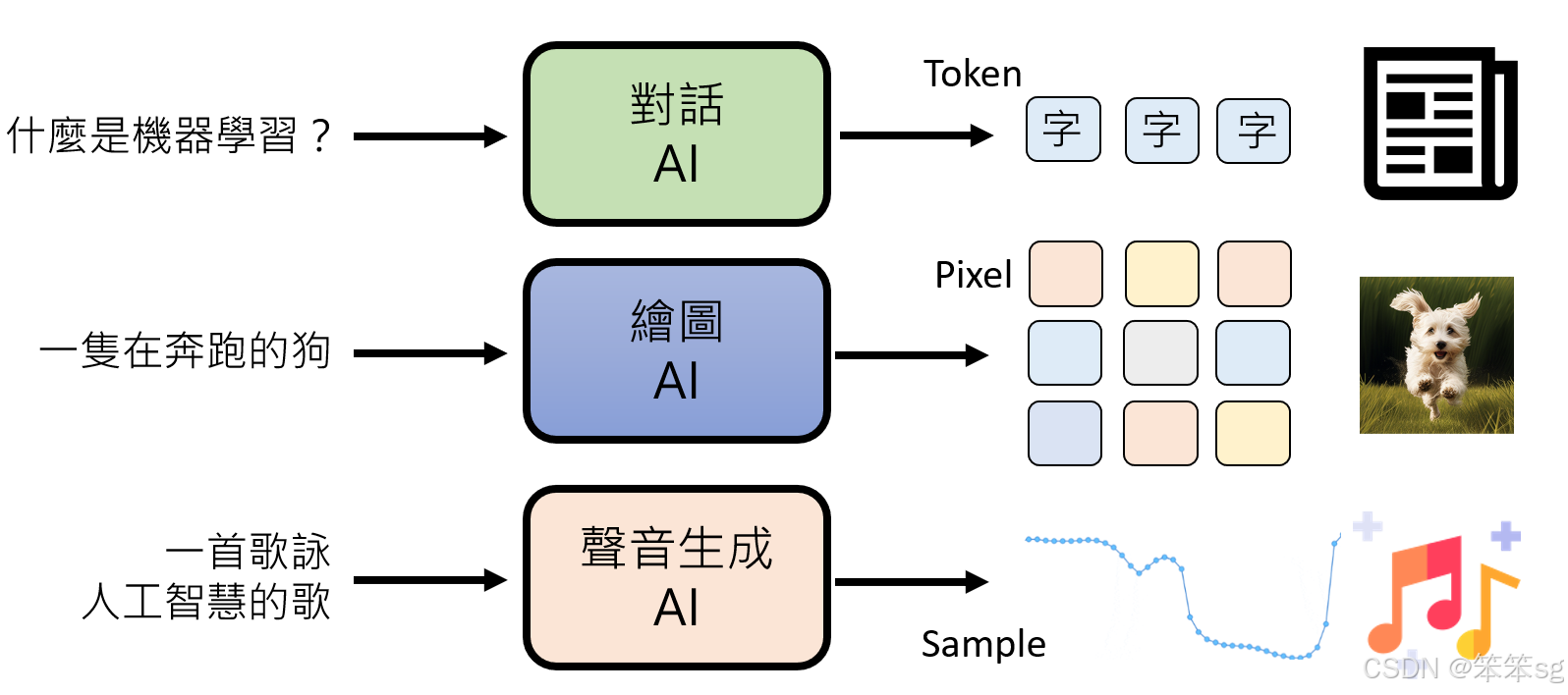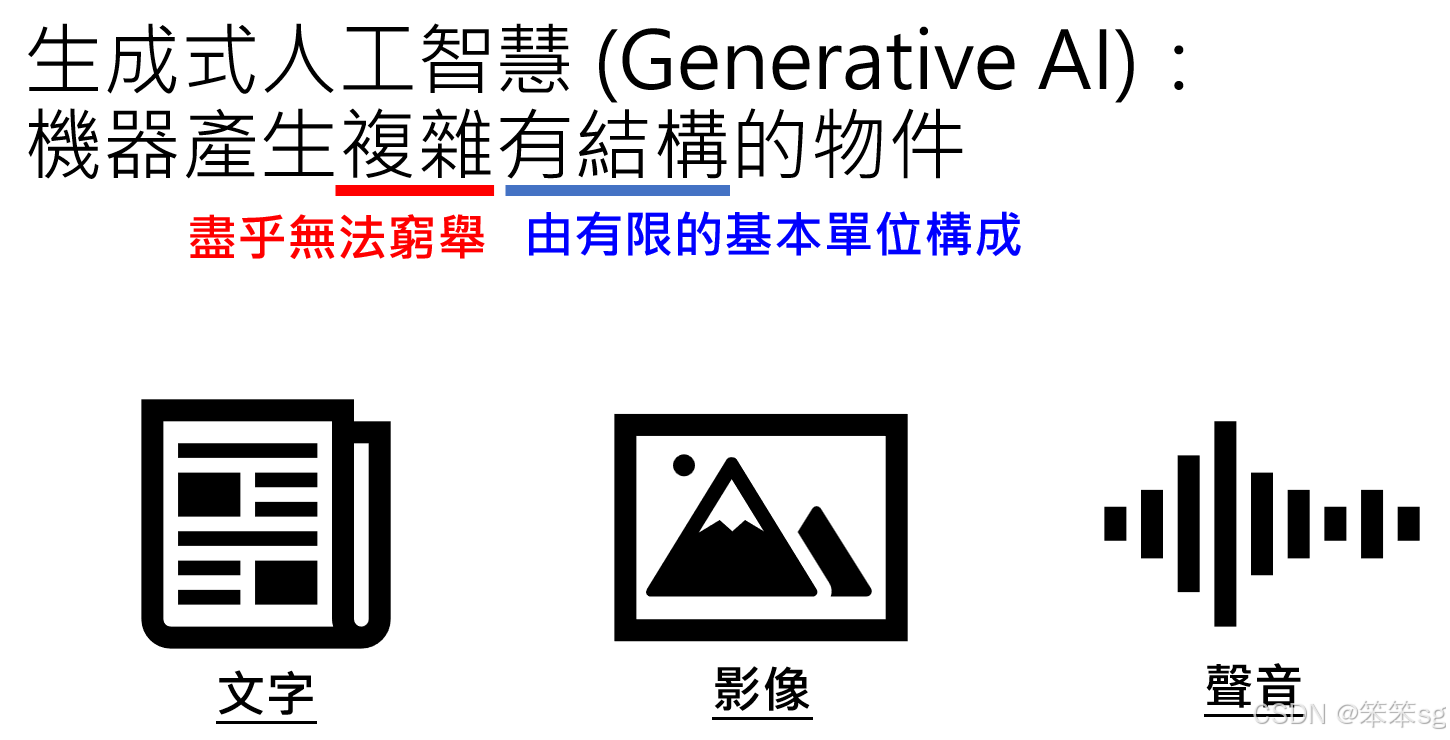 定义:生成式人工智能旨在让机器生成复杂且有结构的物件,如文字、影像和声音。