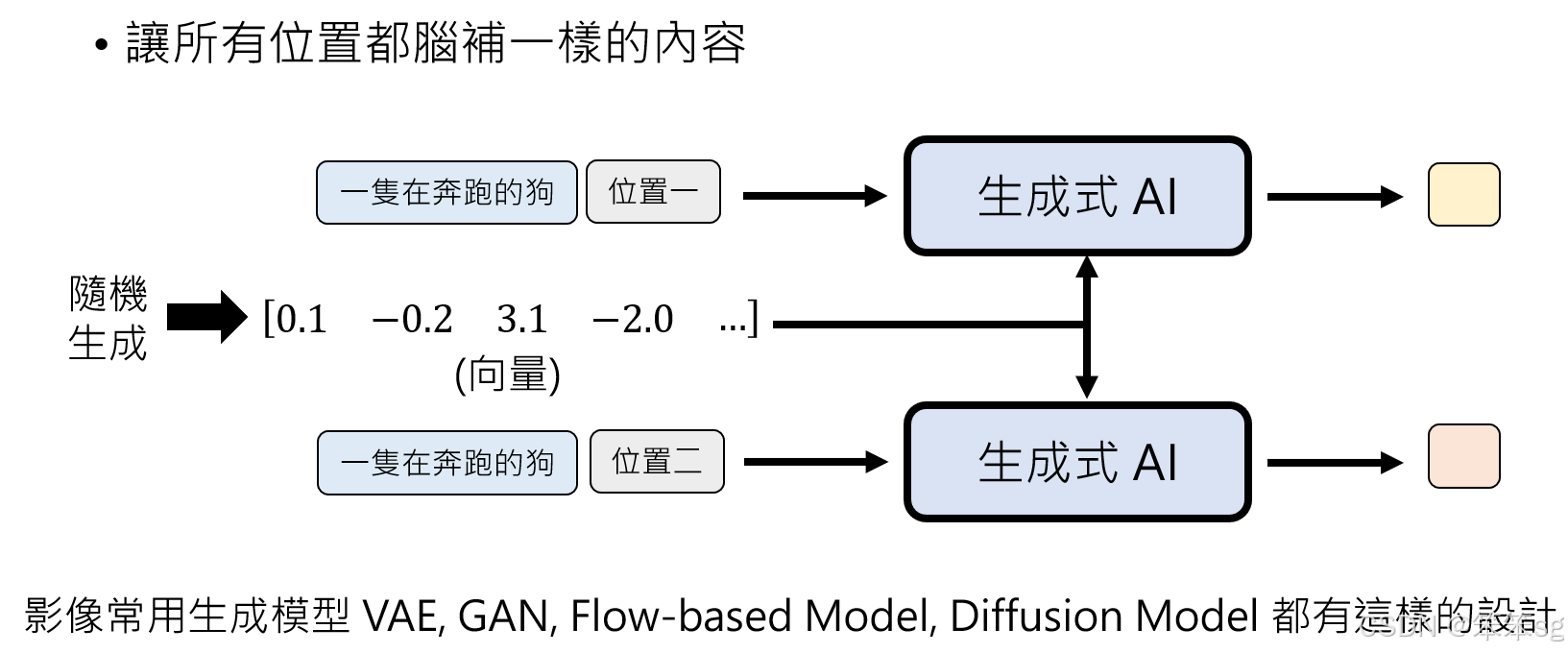 在影像生成中,尤其是像VAEs(Variational Autoencoders)、GANs(Generative Adversarial Networks)、Flow-based models和Diffusion models等模型中,确实普遍采用了一个设计:先生成一个随机向量,然后将这个向量作为输入之一,与其他条件信息(如文字描述)一起输入到生成模型中。