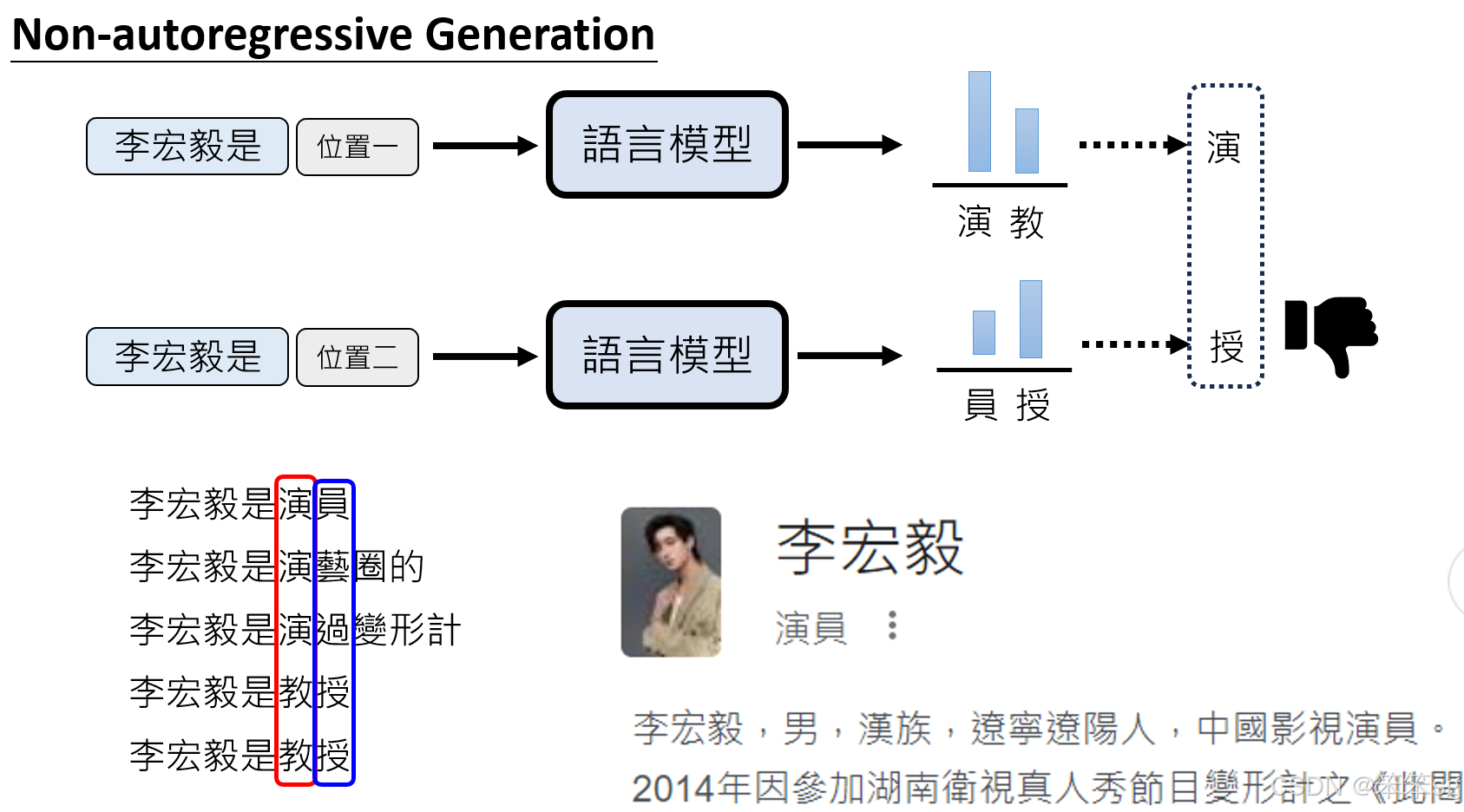 例子:你提到的例子“李宏毅”,在NAR生成中,模型可能会在不同位置生成不一致的输出(例如,“李宏毅是演员”与“李宏毅是教授”这两种可能性)。如果在生成时没有依赖于前面的上下文,这种多样性可能会导致语句不连贯或者语义模糊。