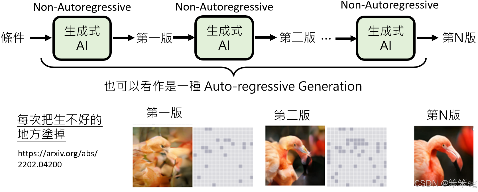 在传统的auto-regressive生成中,可能需要大量的时间来生成较大的图像(如256×256)。为了加速这一过程,可以将auto-regressive的部分替换为non-auto-regressive生成(这也可以看做是一种自回归,哈哈)。non-auto-regressive模型的每个生成步骤可以大大减少所需的计算量,从而提高效率。例如,原本需要256×256次生成的过程,使用non-auto-regressive模型可能只需要十次生成步骤。