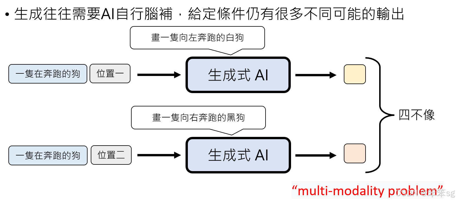 多样性和一致性的问题(More Time Modality): NAR生成的核心问题之一是它容易产生不一致的结果。例如,在图像生成中,如果我们并行地生成每个像素,模型可能会对同一图像的不同部分产生不同的理解,从而导致生成的图像混乱,出现不一致的情况。类似的,在文本生成中,NAR可能会在生成不同token时,模型在“脑补”时产生不同的上下文或含义,导致生成的文本缺乏逻辑连贯性和一致性。