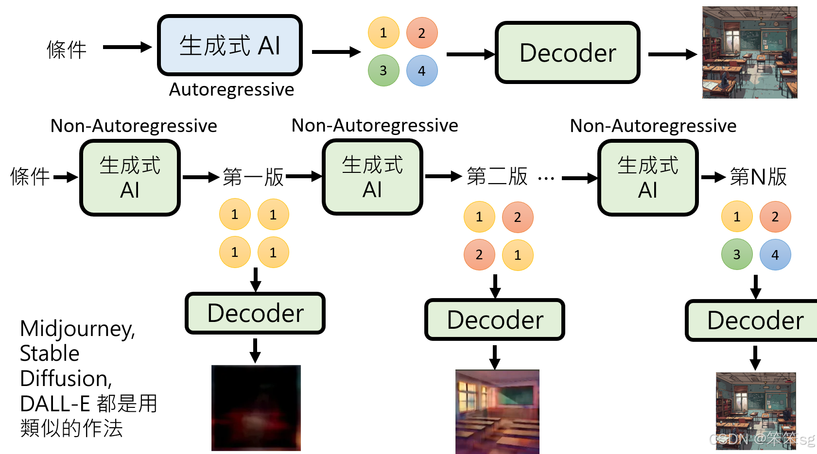 - 综合利用: 通过结合auto-regressive和non-auto-regressive模型的优点,可以在保证生成质量的同时提高生成效率。现代的影像生成模型,像MidJourney和Stable Diffusion,就是通过这两种方法的结合,既能保持较好的生成质量,又能提升生成速度。