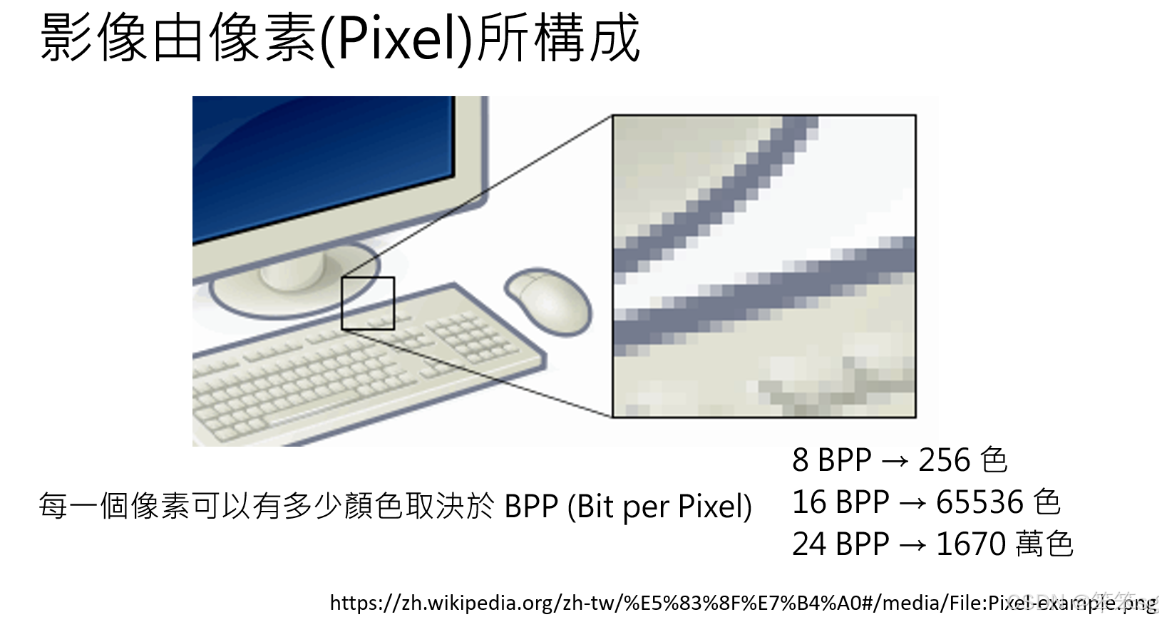 - 每个像素由颜色表示,其值由位深度(BPP, Bits Per Pixel)决定: