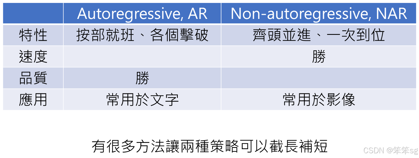 总结来说,auto-regressive和non-auto-regressive各有优缺点,理想的情况是将这两种方法结合起来,以实现既高效又高质量的生成效果。