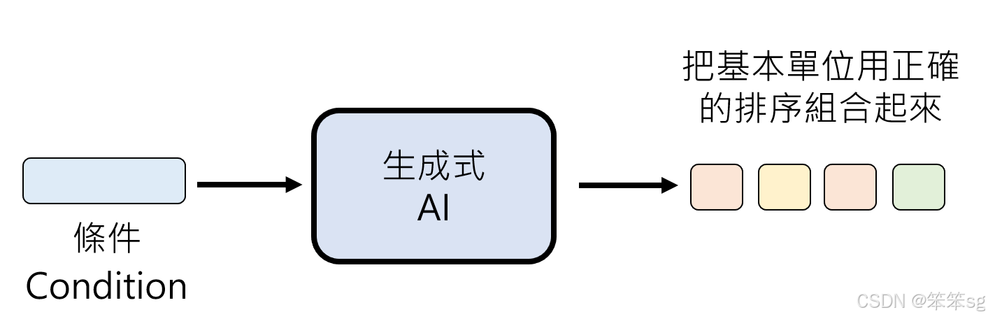 定义:生成式人工智能的核心目标是:根据一个条件(Condition),将基本单位以正确的顺序组合起来,形成复杂的输出。