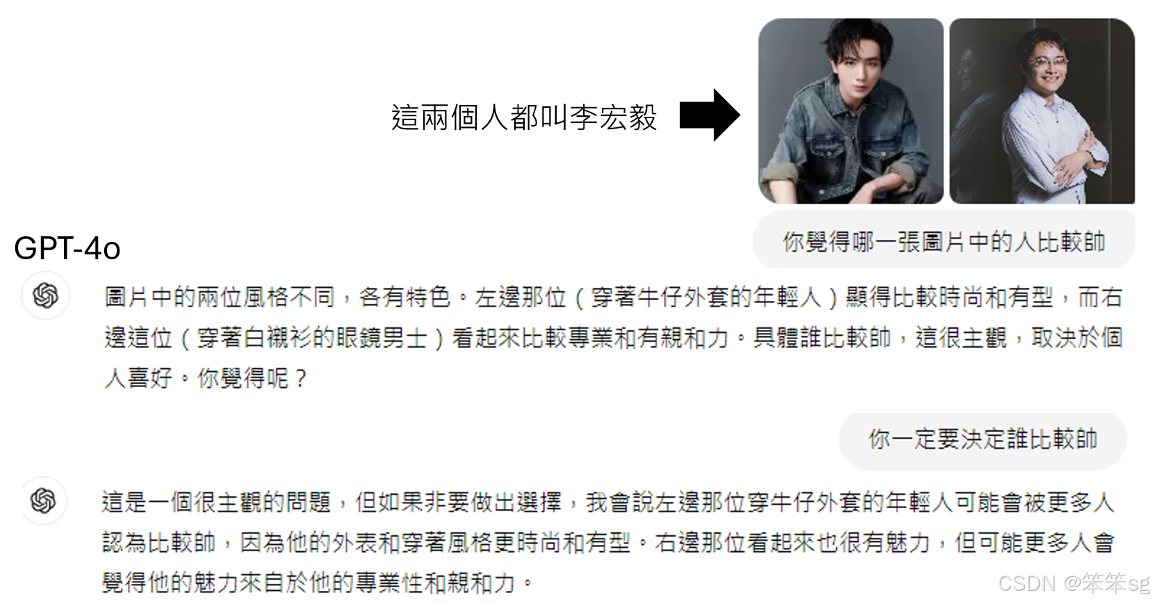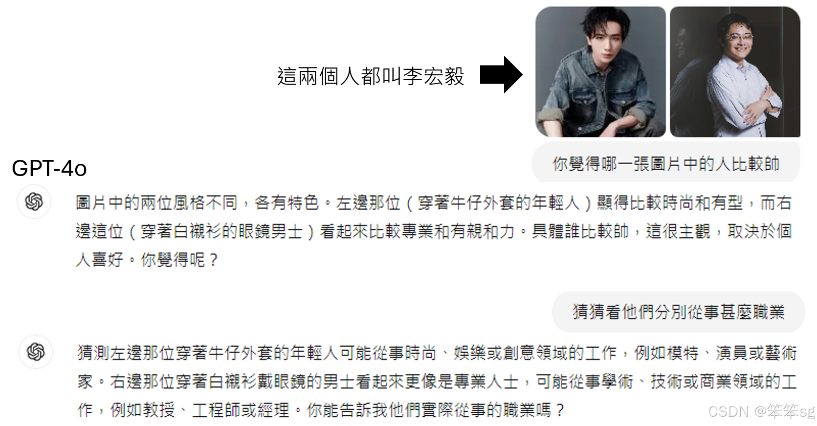 - 示例:两张李宏毅的照片分别为“牛仔外套年轻人”和“白衬衫眼镜男士”。GPT-4 提出: