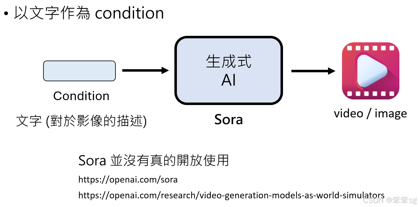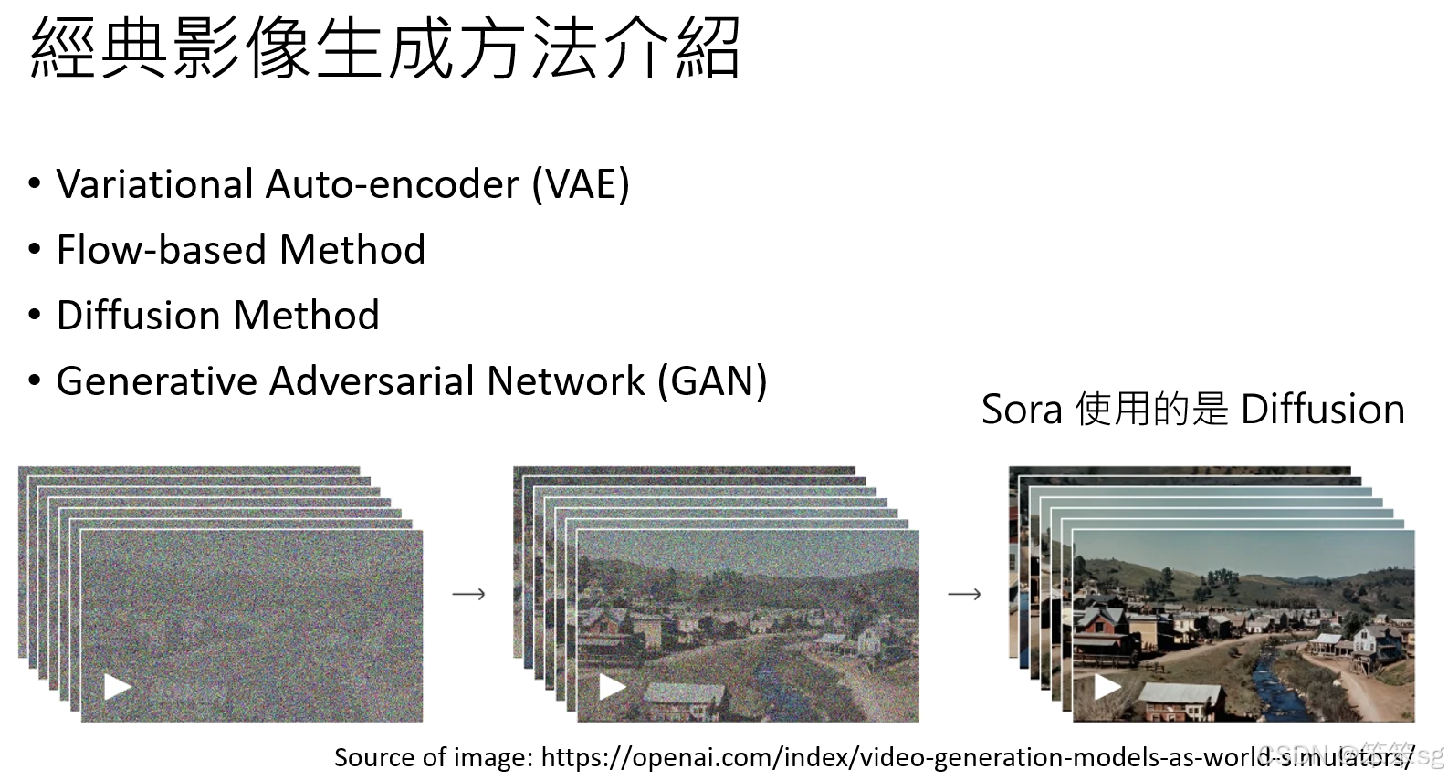 参考链接:OpenAI 提供的官方博客中展示了 SORA 的生成实例(课程投影片附链接)。网络上流传的许多 SORA 示例影片也来源于这些官方展示。可惜的是,今年2月横空出世 声势浩大的SORA截至目前(2024年12月)还未对外界开放使用。