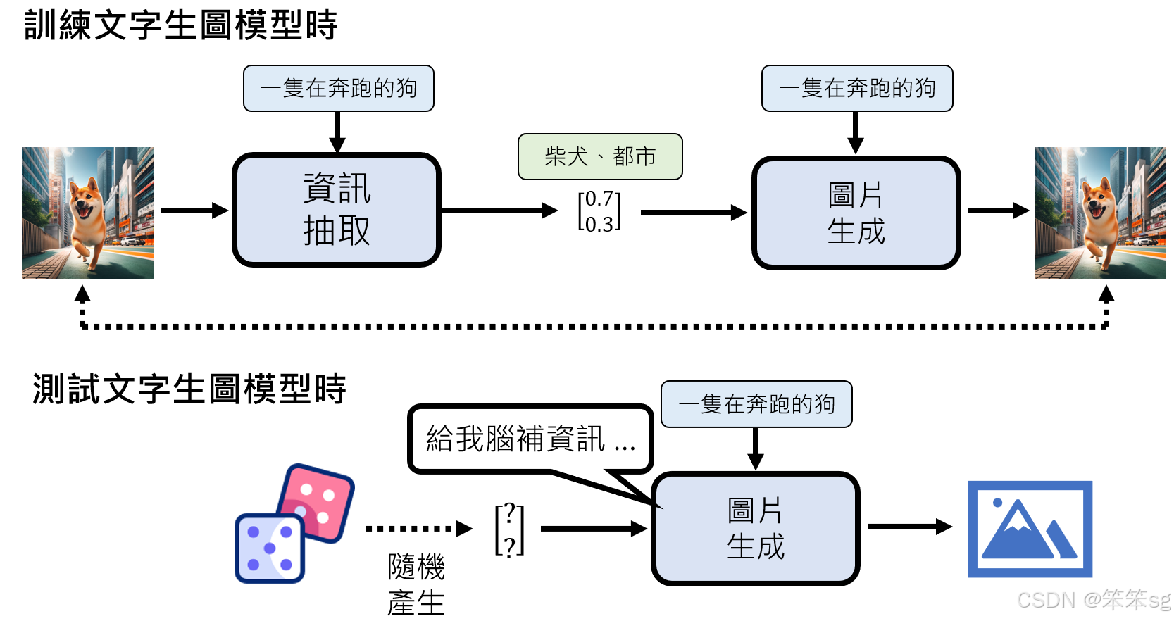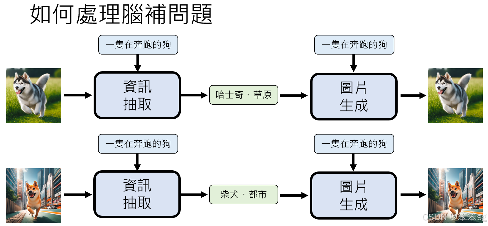 Flow-based model,如 Glow,是通过可逆的变换将输入映射到潜在空间。对于文字描述生成图像,通常采用 条件 Flow-based model(如 Conditional Glow)。以“狗在公园里跑”的描述为例,过程如下: