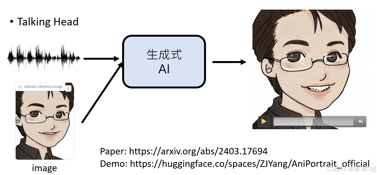 - 给定一段录音和一张照片,AI 生成对应的口型和面部表情,使照片中的人物看起来在说话。