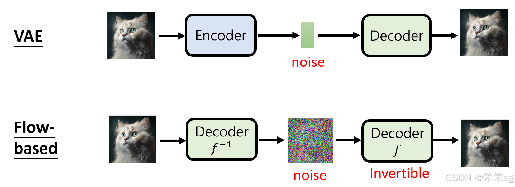 - VAE 和 Flow-based model 都使用 Encoder 和 Decoder,它们通过映射和重建图像来处理数据。