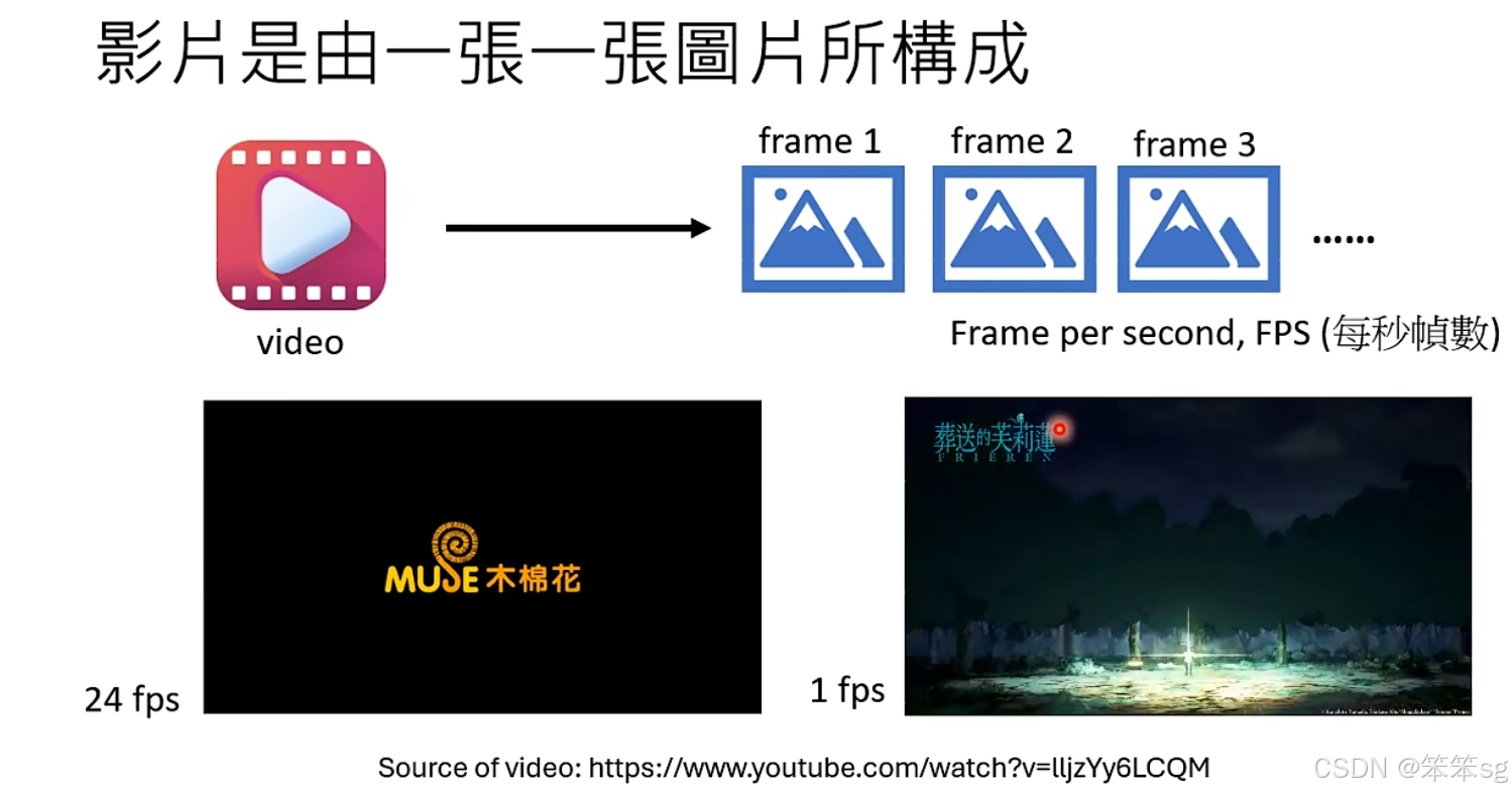 - 影片是一系列连续的图片(帧)组合而成的动态视觉效果。