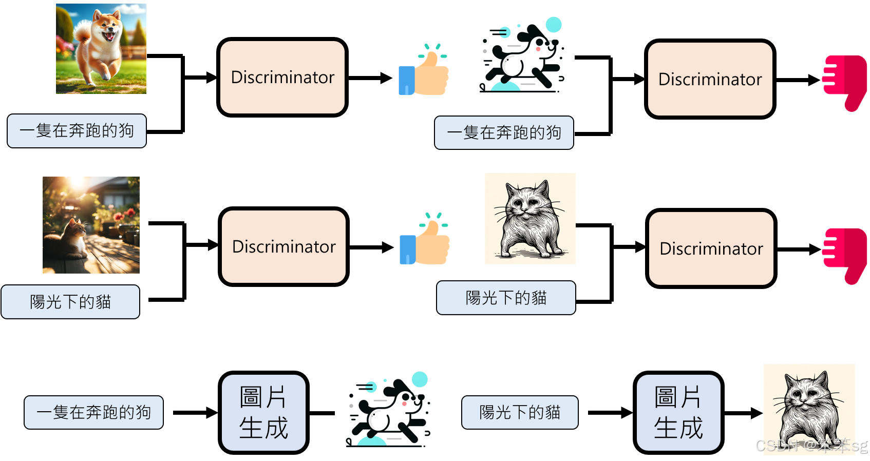 - 判别器:判别器接收这张图像和文本描述,评估它们的匹配度。如果生成的图像质量差,判别器给出较低的评分。
