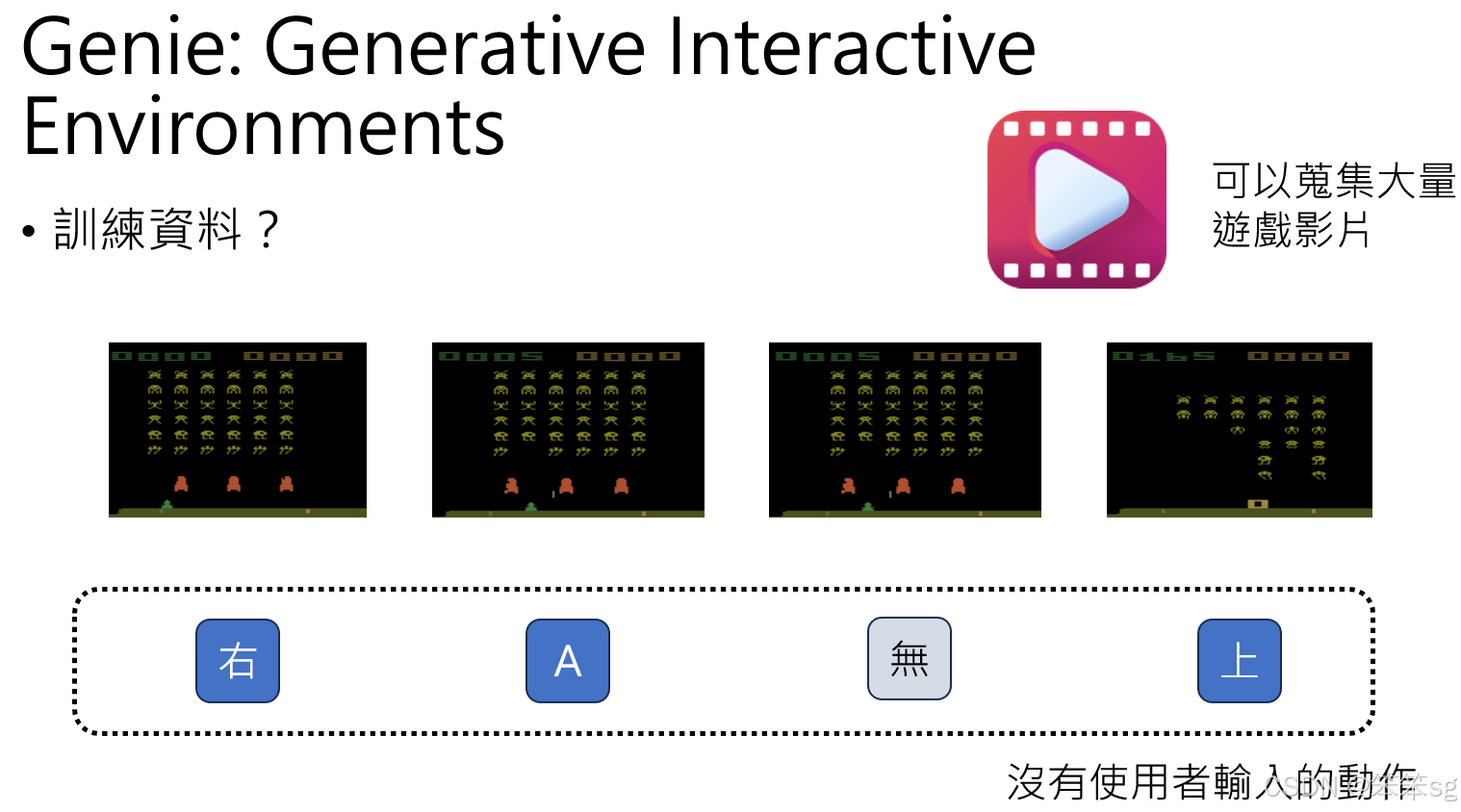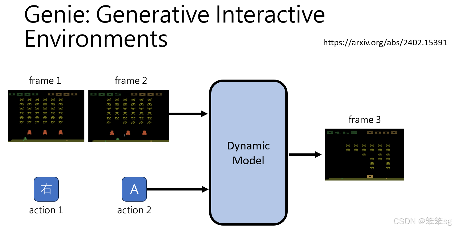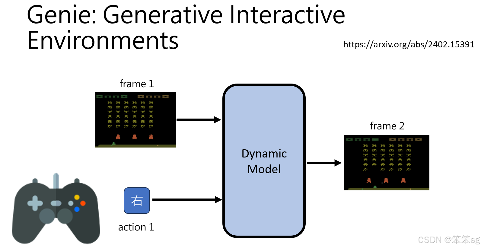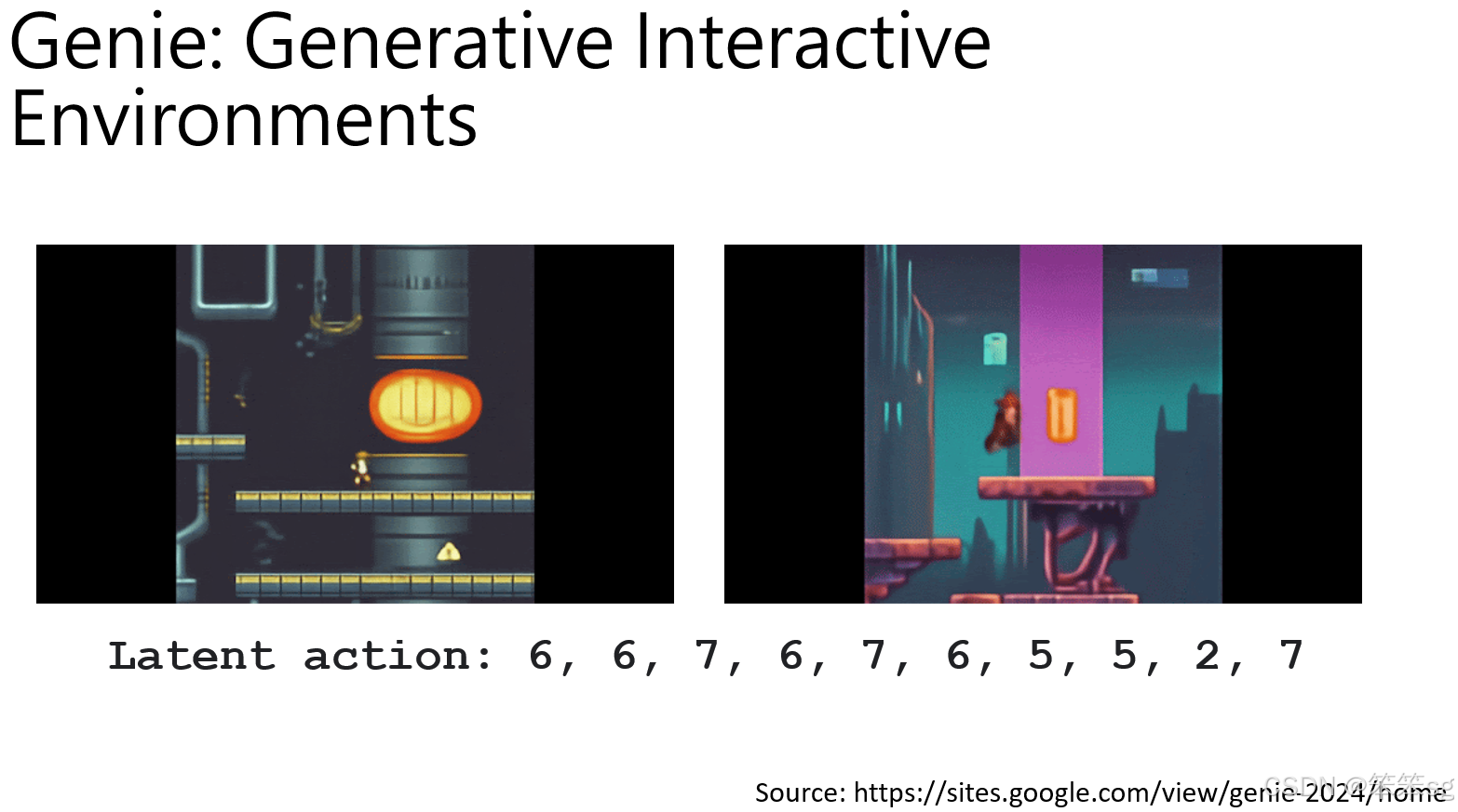 一篇名为“Generated Interactive Environment”(Genie)的论文试图做的就是这种交互。JI的模型读取游戏画面作为输入,并接受玩家输入的动作(如按下的按钮)作为控制信号,从而生成新的游戏画面。通过这种方式,玩家可以实时操控角色在游戏世界中行动,每次按下不同的按钮,就能看到不同的游戏场景和结果。