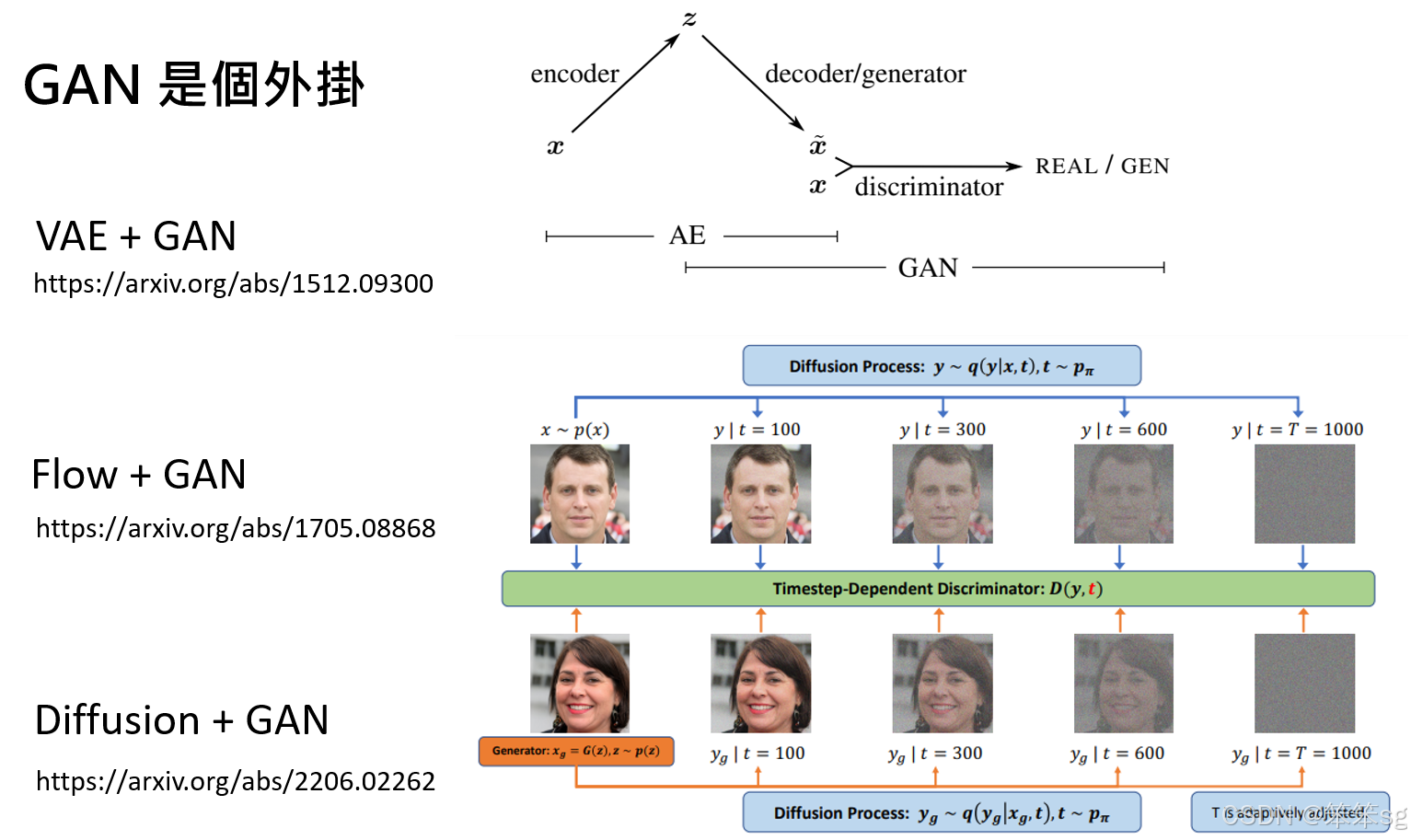 - 例如,在 Diffusion 模型中,加入一个 GAN 的框架,通过判别器的对抗训练,可以帮助提升生成图像的质量。此时,GAN作为一个“外挂”帮助优化生成过程。