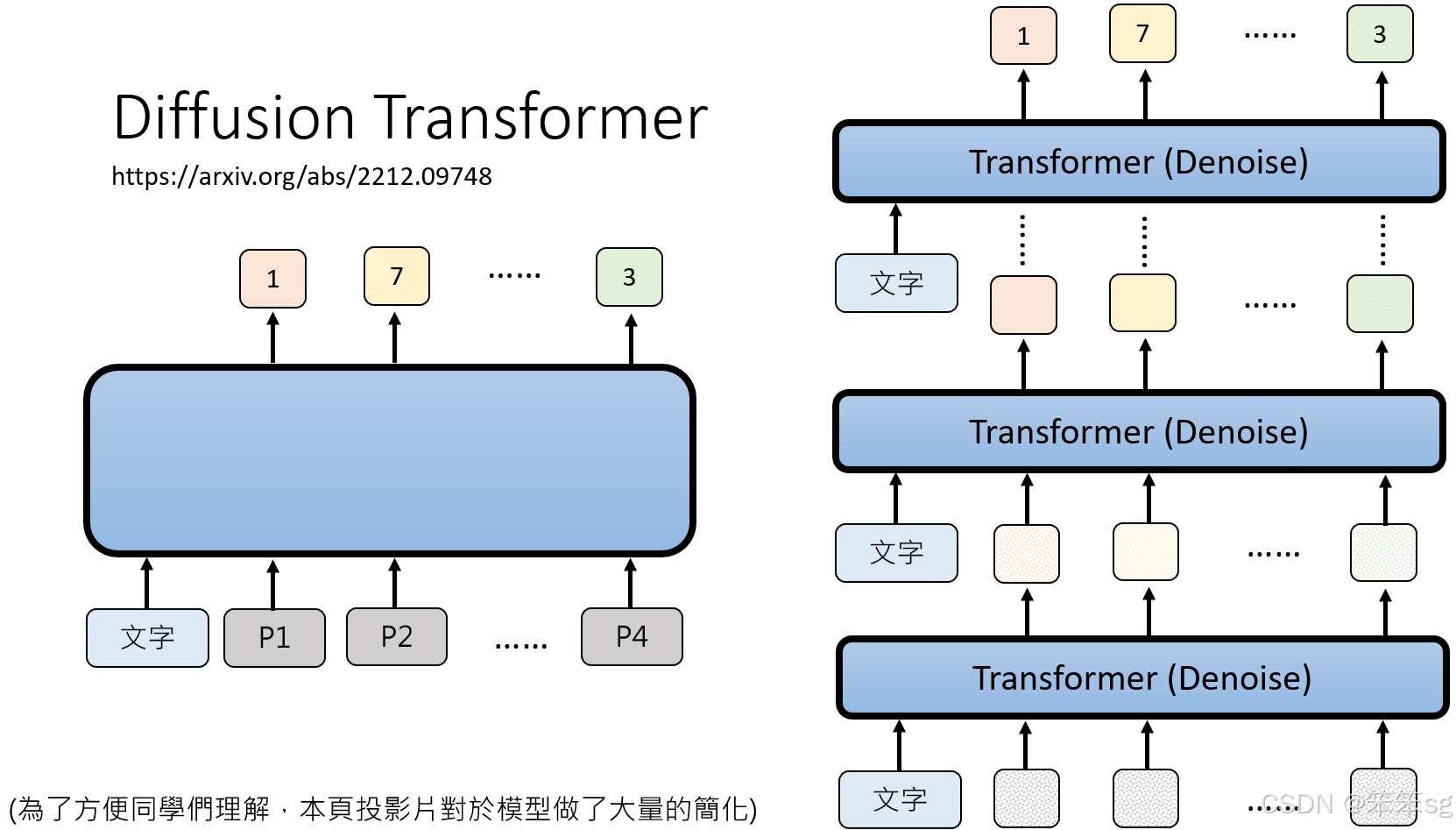 - Patch逐步清晰化:Diffusion Transformer通过多次迭代,逐步将噪声图像的patch清晰化,最终得到一个接近目标图像的patch。每次迭代的任务是去除噪声,而这个过程被Transformer模型通过不断调整去噪操作来完成。