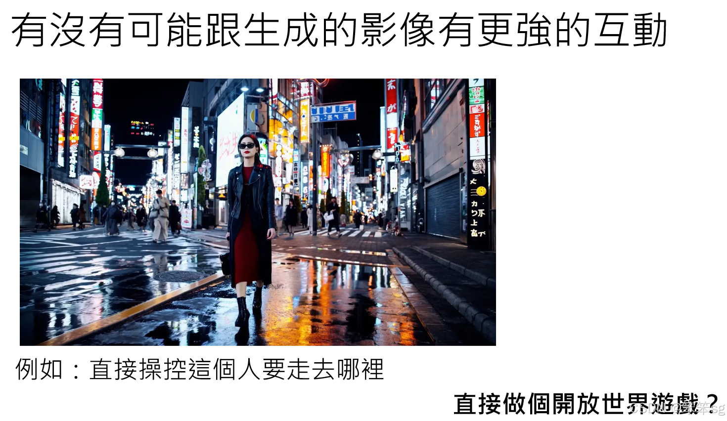 目前,人工智能已经能够生成图像,但是否能让人类与这些深层图像产生更即时的互动呢?例如,我们可以控制一个角色在东京街头行走,并通过按上下左右来决定角色走哪条路。这样,不仅能通过影像生成技术操控游戏角色的行为,还能创造一个类似开放世界的3D游戏。虽然这种互动看起来很吸引人,但实际操作中,很多图像生成技术仍然依赖于较简单的2D横向卷轴游戏模型。