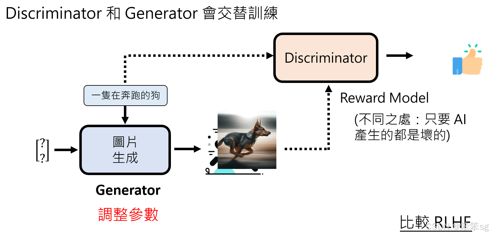 - 在 RLHF 中,reward model 用来评价生成模型的输出,而 GAN 中的判别器充当了类似的角色。RLHF的reward model通常依赖于人工标注的好坏评价,而 GAN的判别器则通过对抗学习,无需人工标注,直接依据模型生成的图像质量来判断。