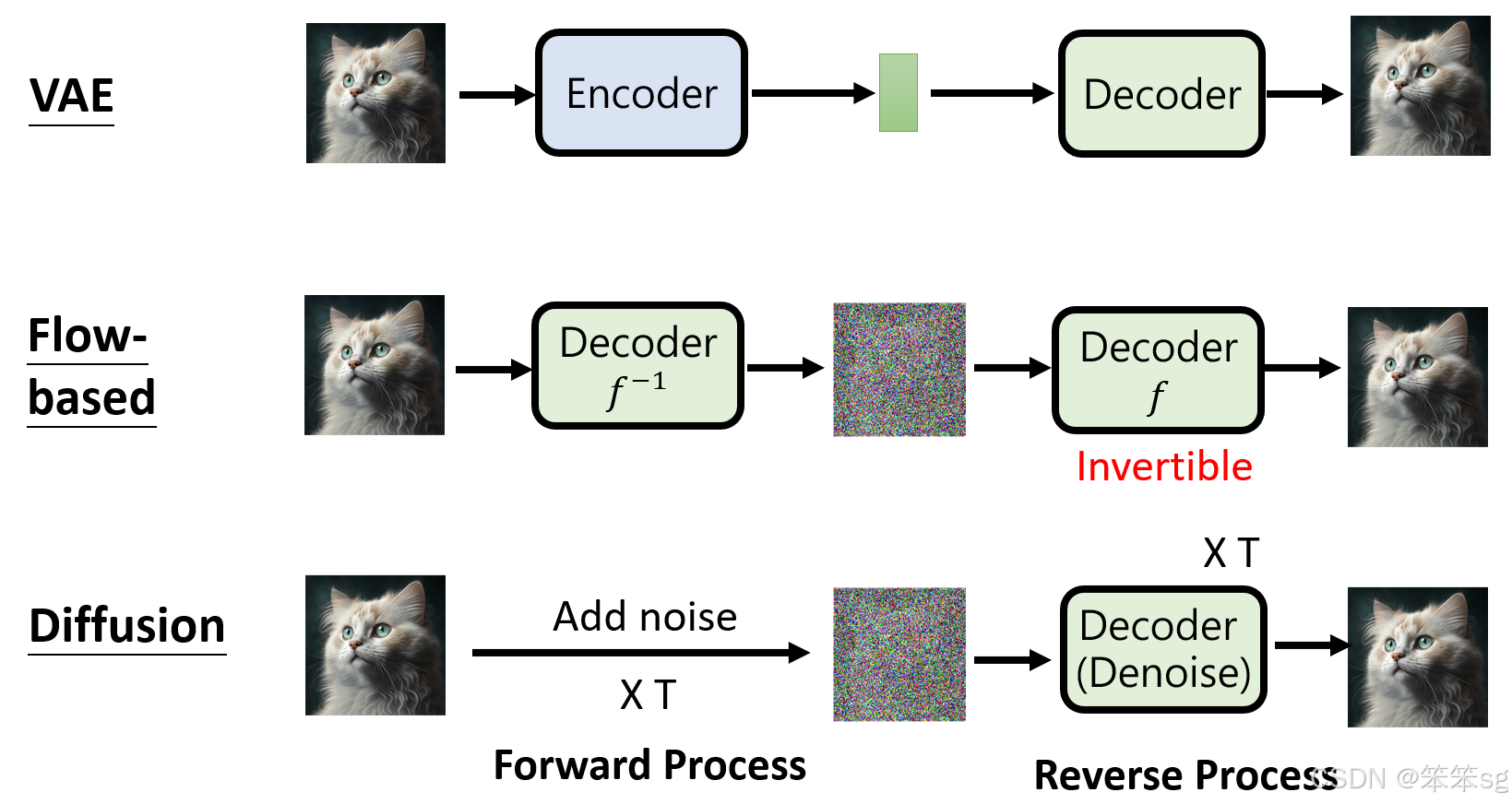 在类比 VAE(变分自编码器)、Flow-based model 和 Diffusion Model 的时候,主要的区别和相似之处在于 编码器(Encoder) 和 解码器(Decoder) 的功能和流程。
