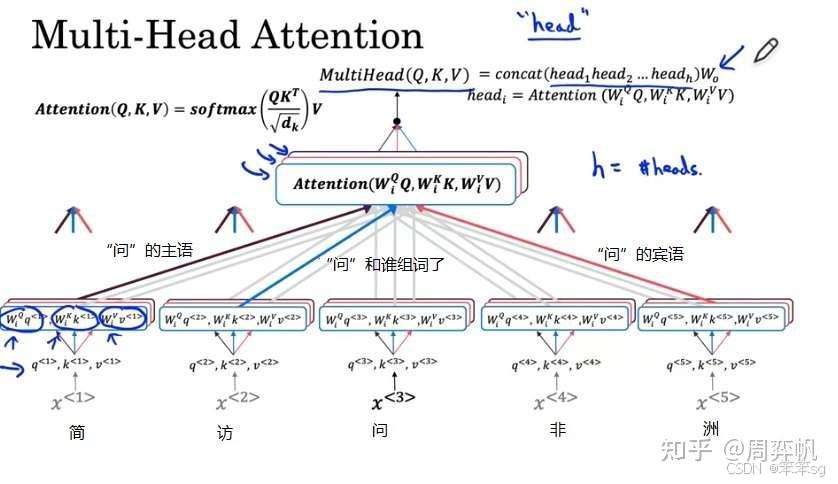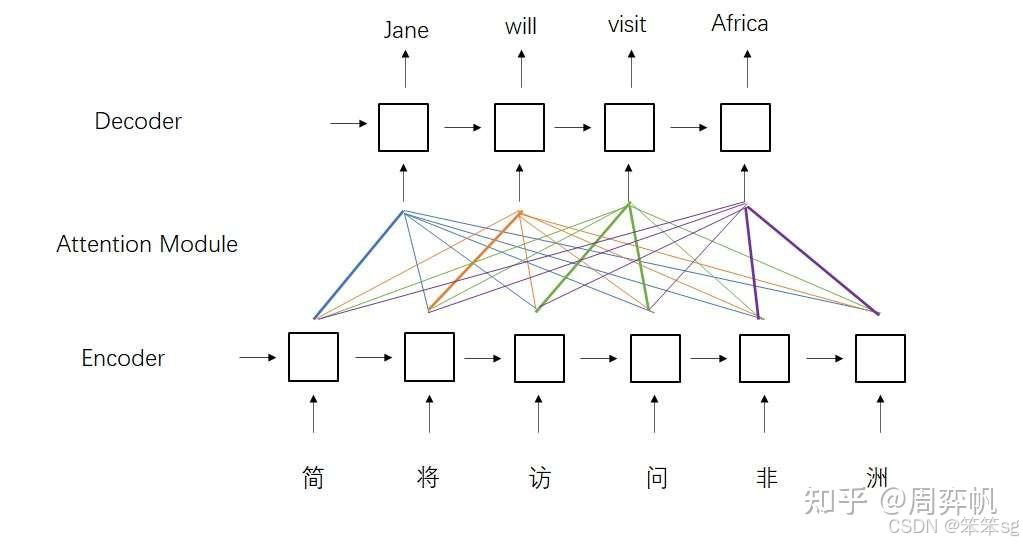 这种设计来自于早期的注意力模型。如下图所示,在早期的注意力模型中,每一个输出单词都会与每一个输入单词求一个注意力,以找到每一个输出单词最相关的某几个输入单词。用注意力公式来表达的话,Q就是输出单词,K, V就是输入单词。