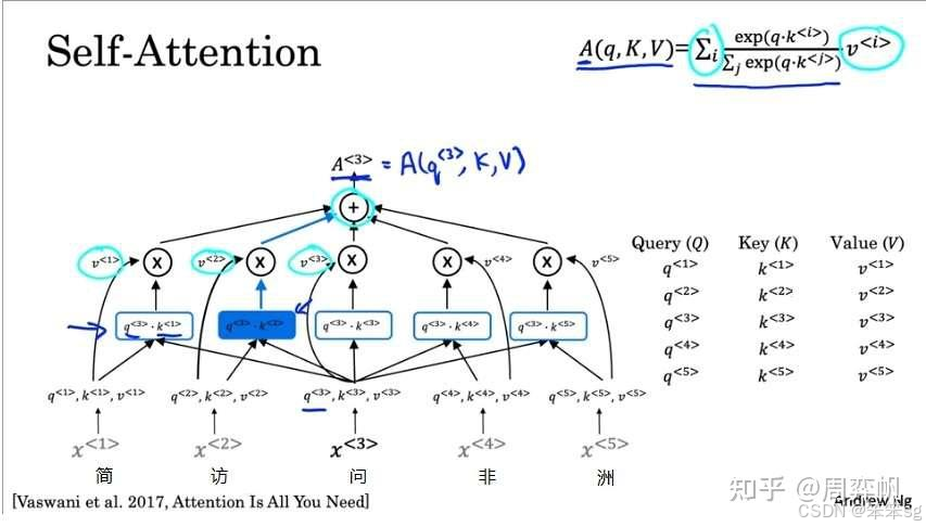 计算k和q之间的匹配度来作为权重得到w(还要经过一个softmax),w乘上v得到一个临时值t,所有的临时值t加起来便得到了一个近似值r(这个r虽然不一定等于“和q最为相近的k对应的v”,但也大差不大了)
