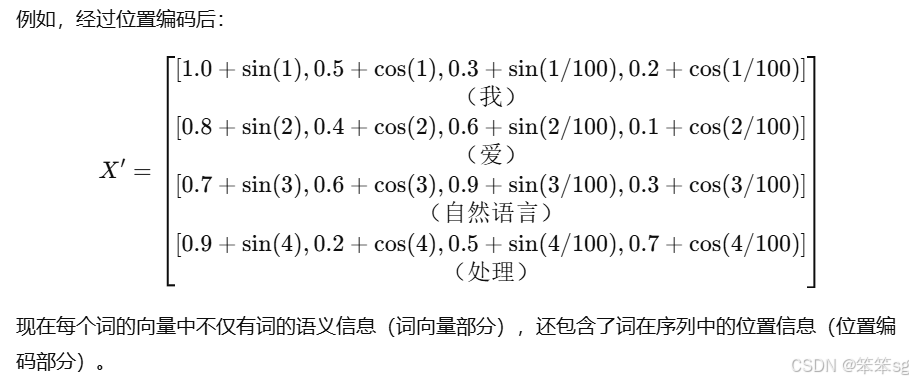 - 第二句话中,第一个词的编码是 x3+PE(1),表示“自然语言”在第一个位置。