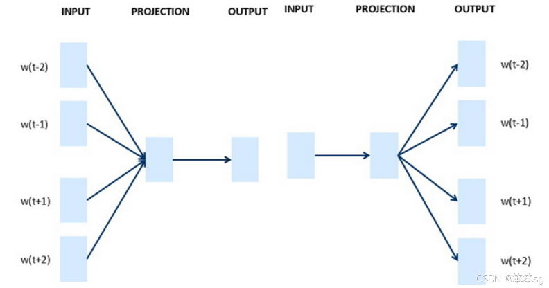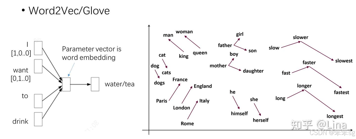 - Word2Vec(2013):Mikolov提出的Word2Vec使用Skip-gram和CBOW模型,将词表示为稠密向量。词向量之间的关系能捕捉语义信息,如“king - man + woman ≈ queen”,之后又有GloVe和FastText等改进模型。