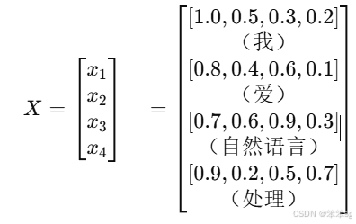 这句话的词向量表示如下(假设每个词用一个向量表示,向量维度为 4):