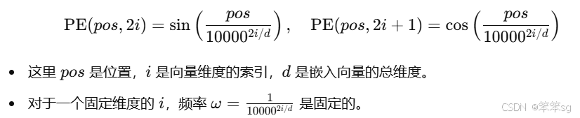 - 对于同一个pos不同的i,即对于一个词嵌入向量的不同元素,它们的编码要各不相同。