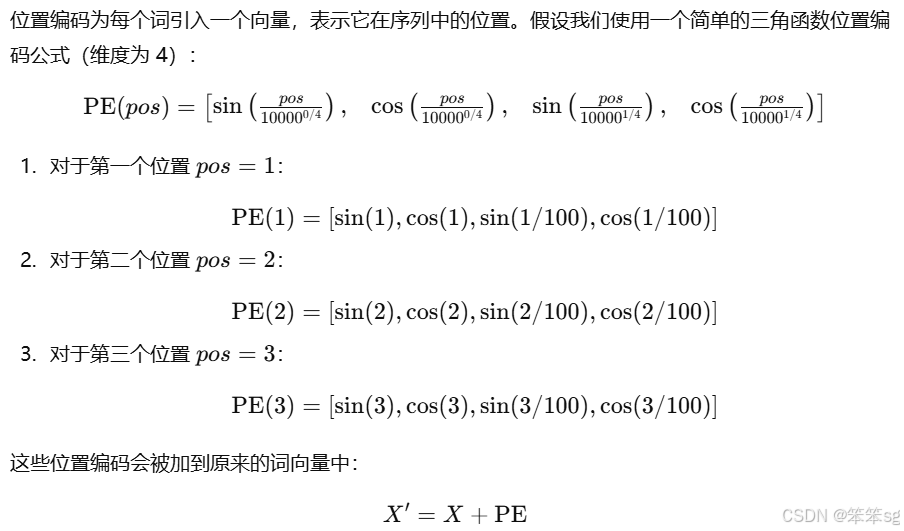 - 第一句话中,第一个词的编码是 x1+PE(1),表示“我”在第一个位置。