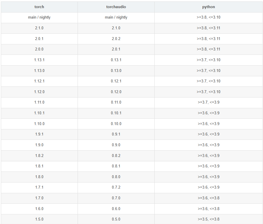 3)根据torch版本确定torchvision与torchaudio版本与python版本