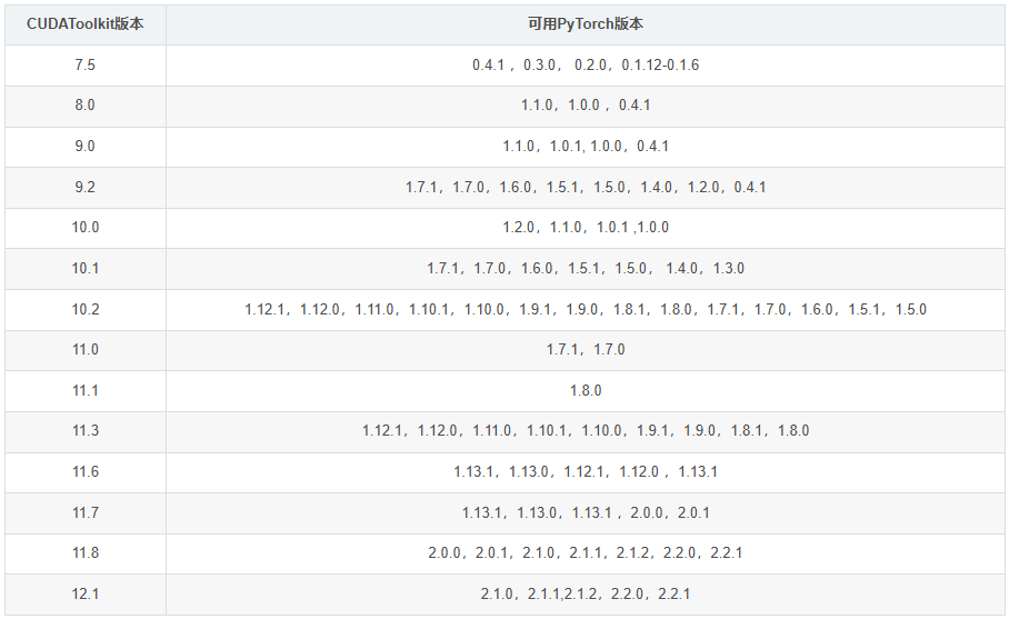 确定了cudatoolkit版本后需要确定torch版本,可以参见下表: