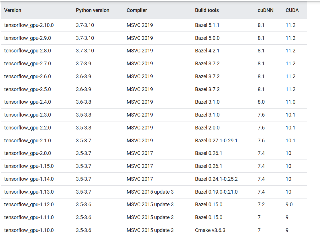 查看tensorflow官网的版本要求:在 Windows 环境中从源代码构建 | TensorFlow(见【经过测试的构建配置】)