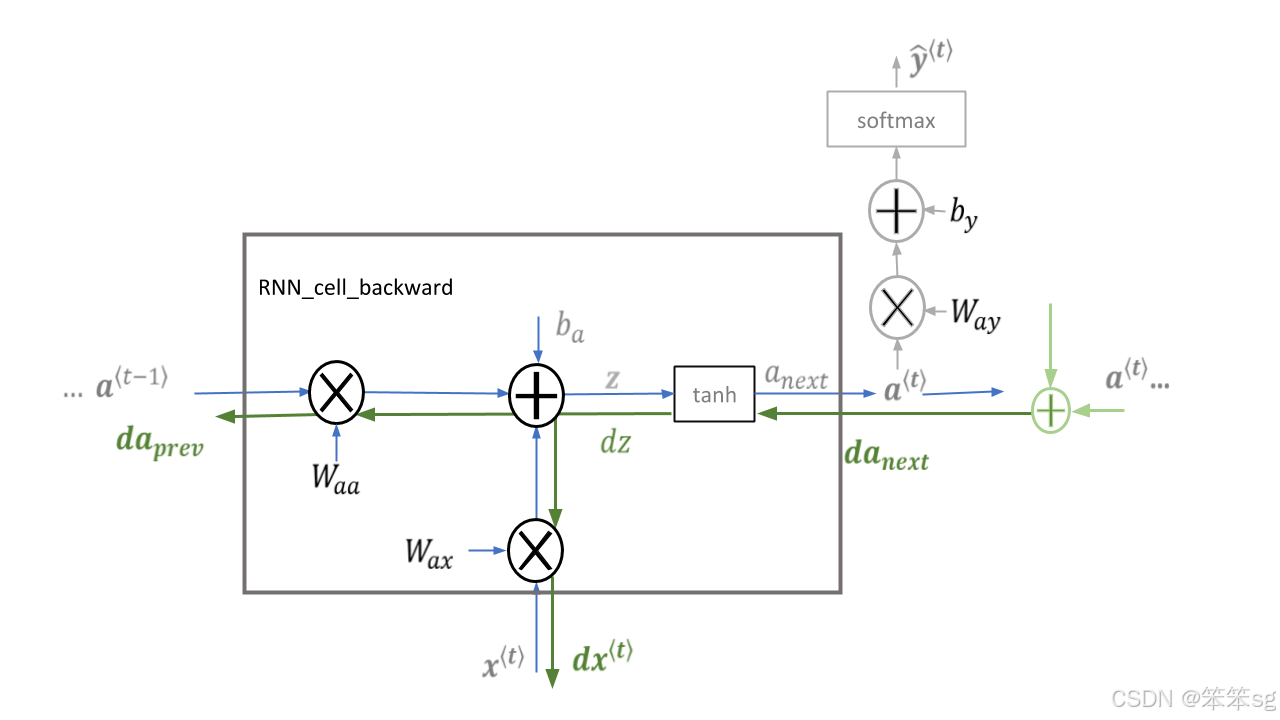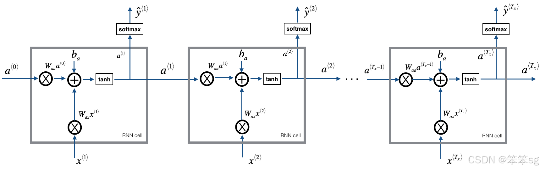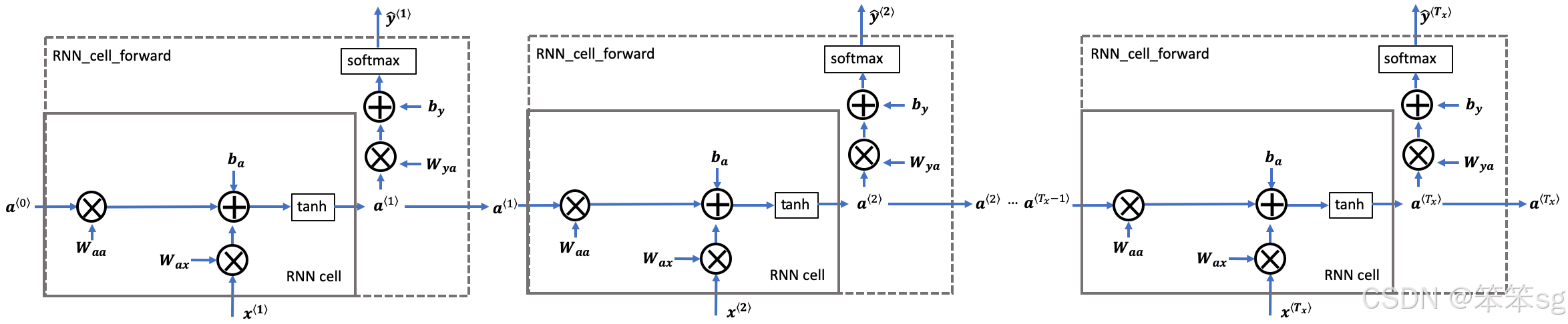- a_next = np.tanh(np.dot(Waa,a_prev) + np.dot(Wax,xt) + ba)