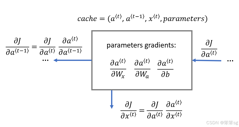 - cache = (a_next, a_prev, xt, parameters)