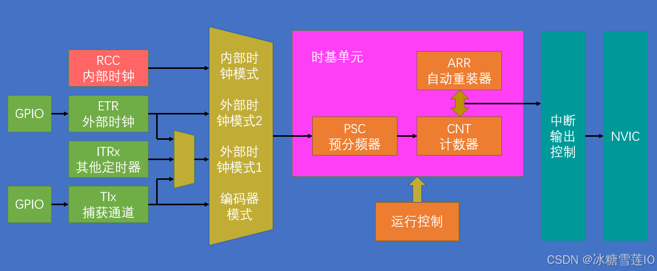 与上一例代码基本相同,仅修改了Timer.c中的初始化时钟RCC、时基单元时钟源、ARR和PSC的取值,增加了GPIO初始化。
