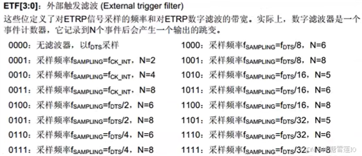 - 第四个参数是外部触发滤波器,参数值为0x00~0x0F之间的一个值。就是以采样频率f采样N个点,如果N个点都一样,才会有效输出,这个值就是决定f和N的,具体对应关系如下图。