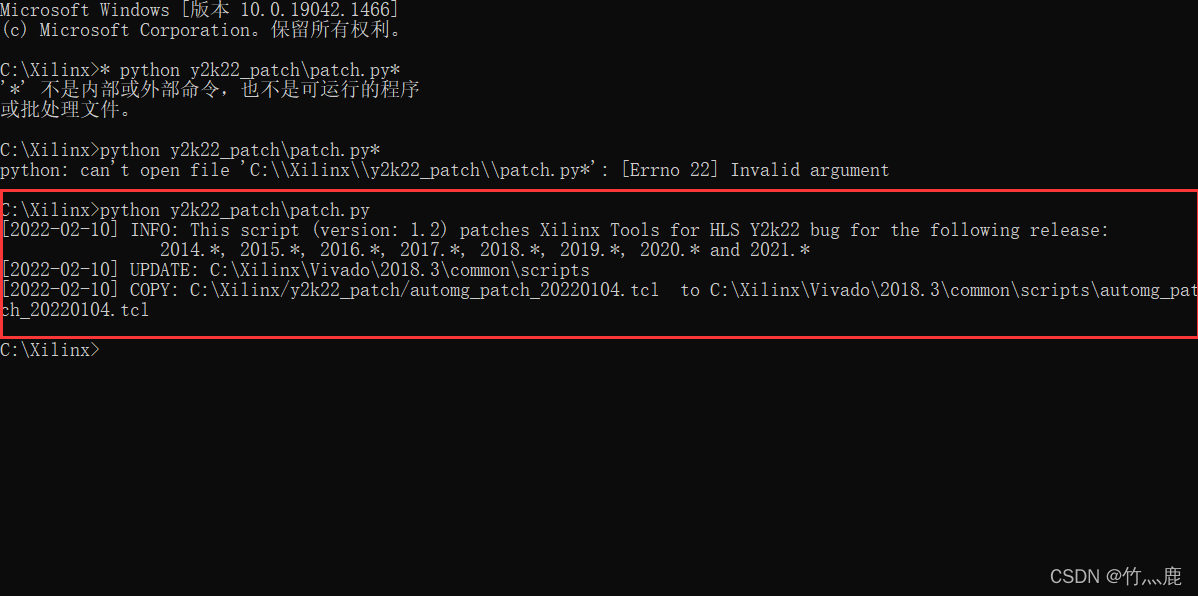 第四步 在C:\Xilinx输入cmd,进入命令行,输入 python y2k22_patch\patch.py 和图中显示一致说明成功。