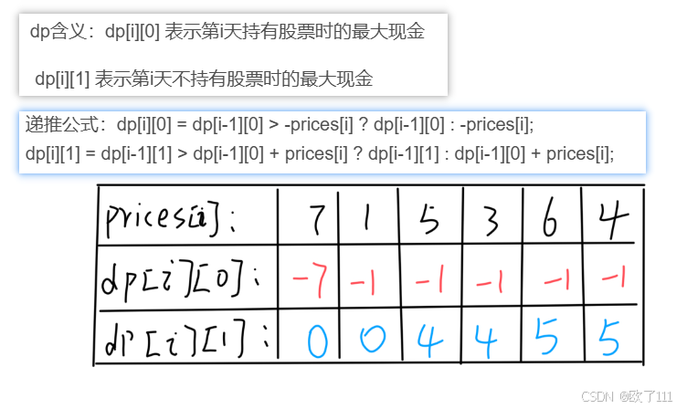 递推公式:dp[i][0] = dp[i-1][0] > -prices[i] ? dp[i-1][0] : -prices[i];