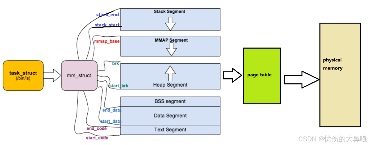 可以说,mm_struct结构是对整个用户空间的描述。每一个进程都会有自己独立的mm_struct,这样每一个进程都会有自己独立的地址空间才能互不干扰。先来看看由task_struct,进程的地址空间的分布情况: