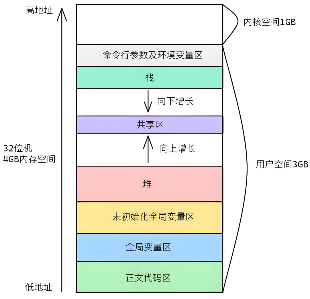 动态扩展:堆(Heap)和栈(Stack)可以按需动态增长,物理内存的分配延迟到实际使用时(如缺页异常触发物理页分配)。