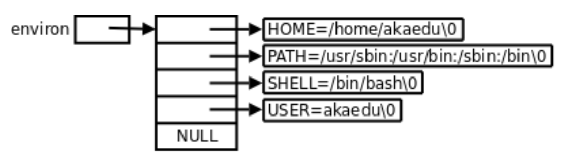 每个程序都会收到一张环境表,环境表是一个字符指针数组,每一个指针指向一个以‘\0’结尾的环境字符串。