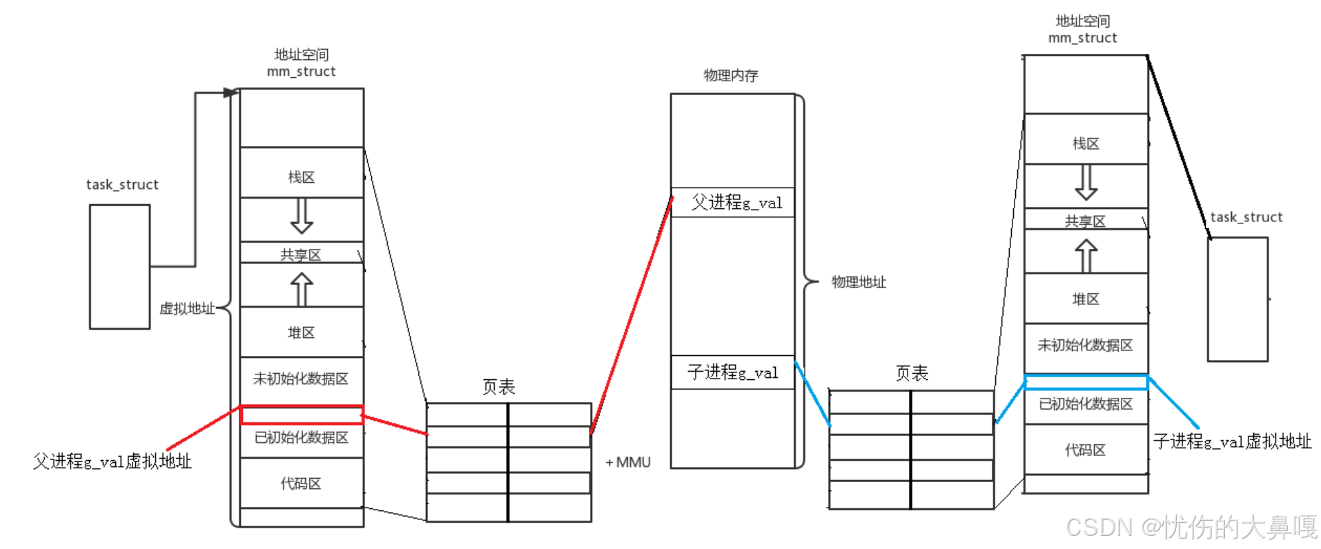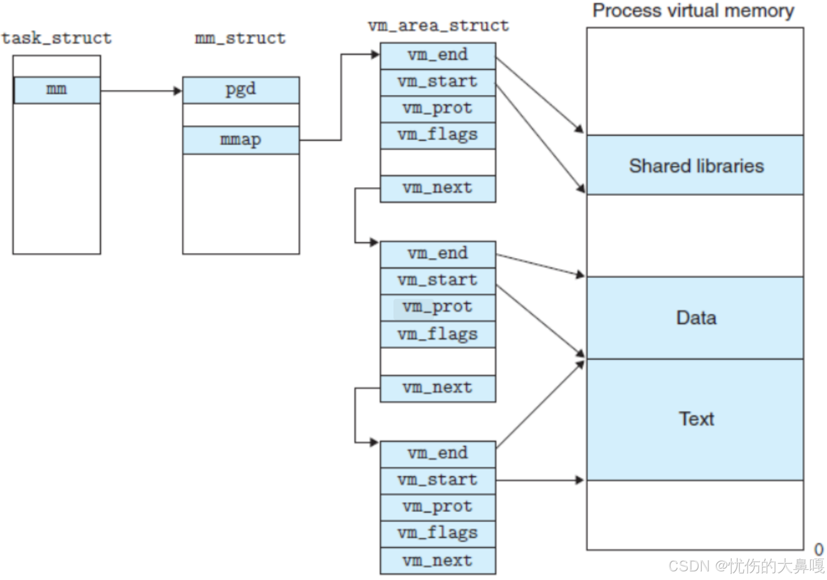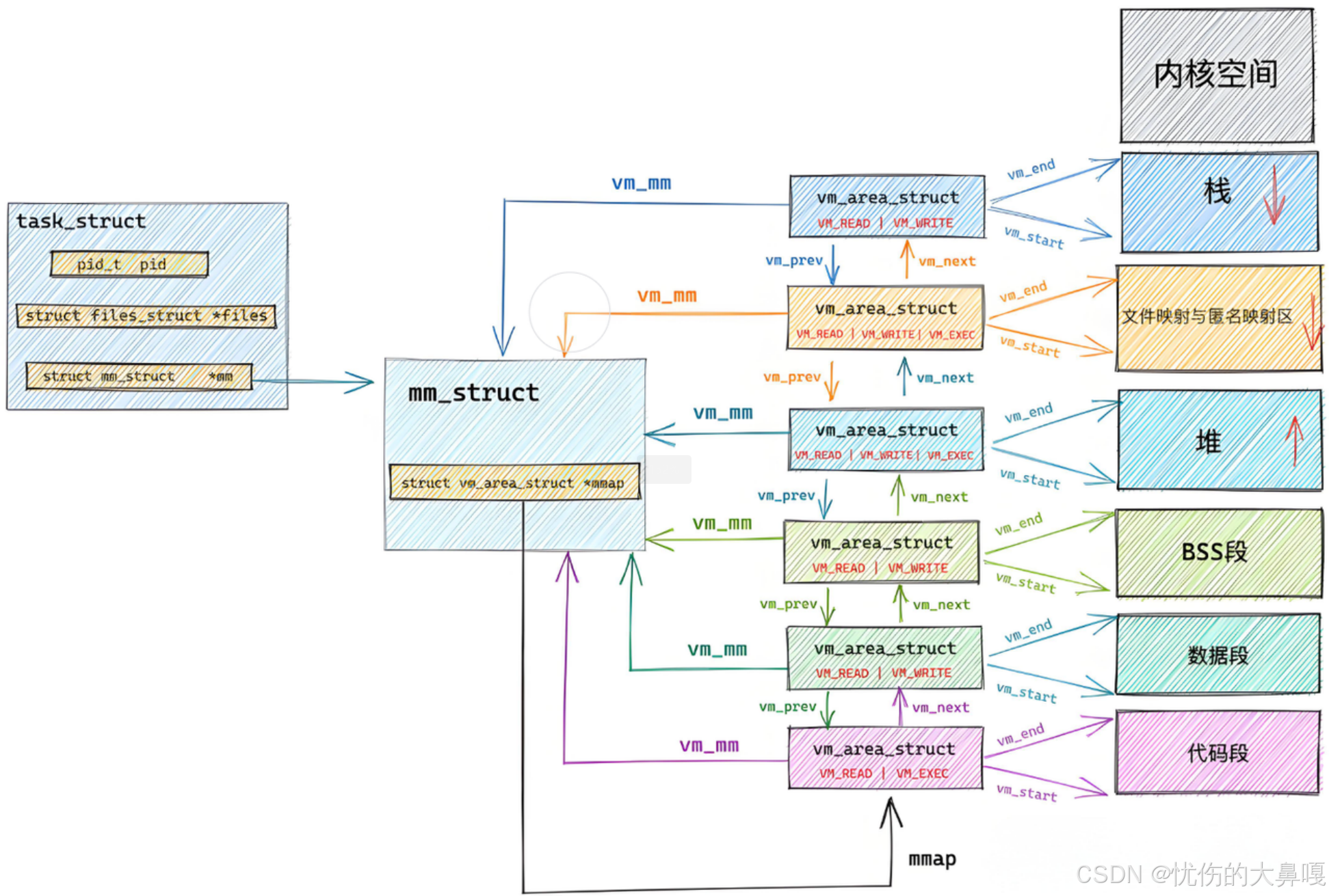 - struct vm_area_struct *vm_next; // 下一个VMA(单链表正向指针)