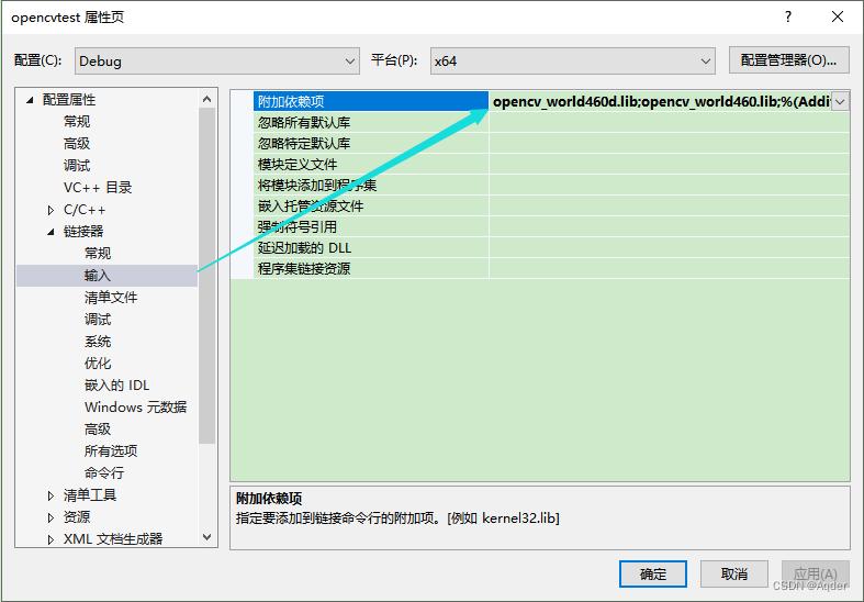 注:opencv_world460d.lib;是在Debug模式下调用,opencv_world460.lib;是在Release模式下调用,此处配置为Debug模式,因此只配置opencv_world460d.lib;即可。