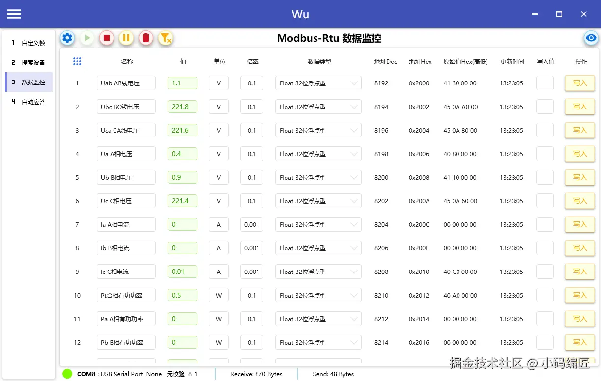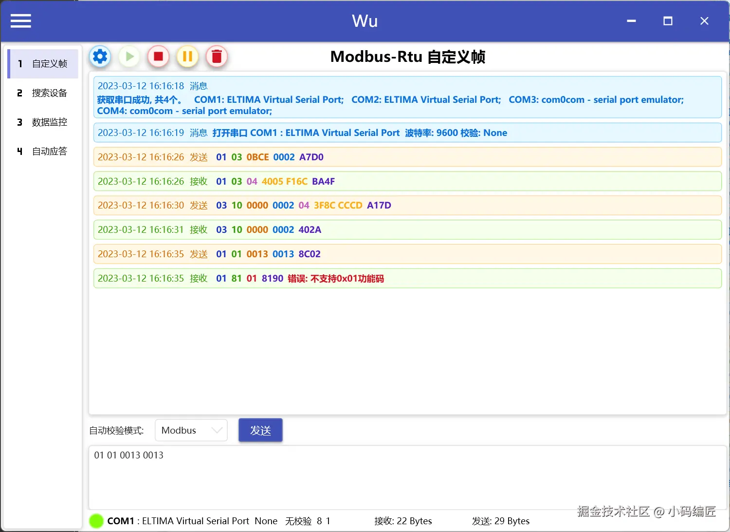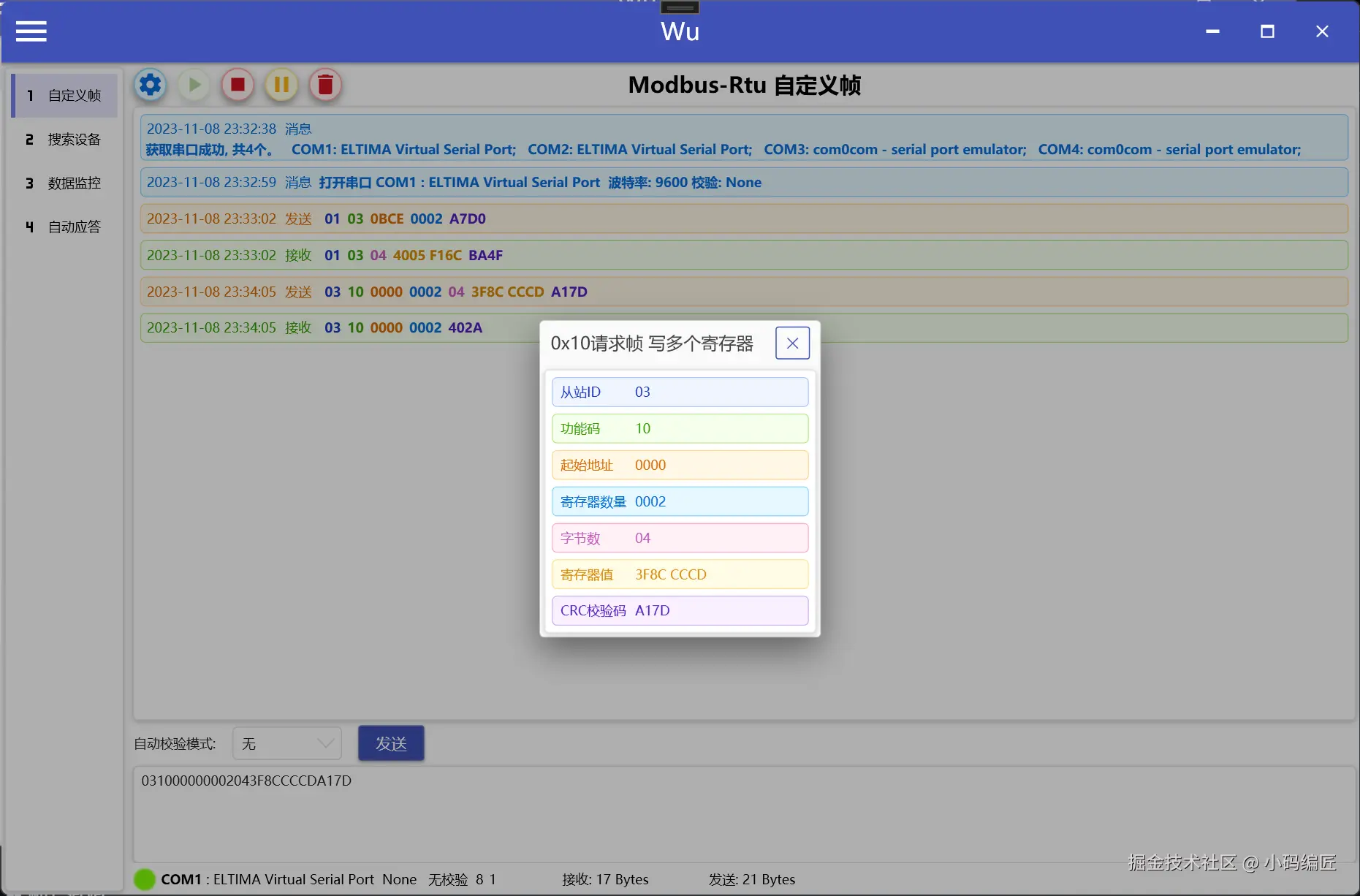 Wu通讯调试工具具备多种特色:支持Modbus RTU及MQTT服务器和客户端调试;采用丰富的界面色彩设计;能够自动解析Modbus RTU数据帧;内置智能防粘包机制,确保在高速传输下帧解析的准确性,对于无法校验的帧会进行错误提示。