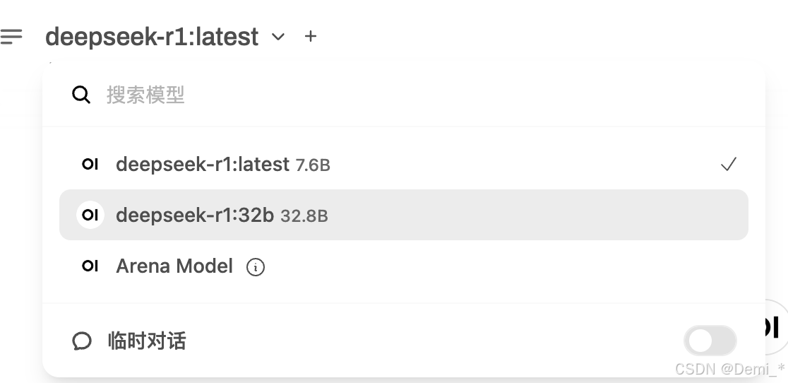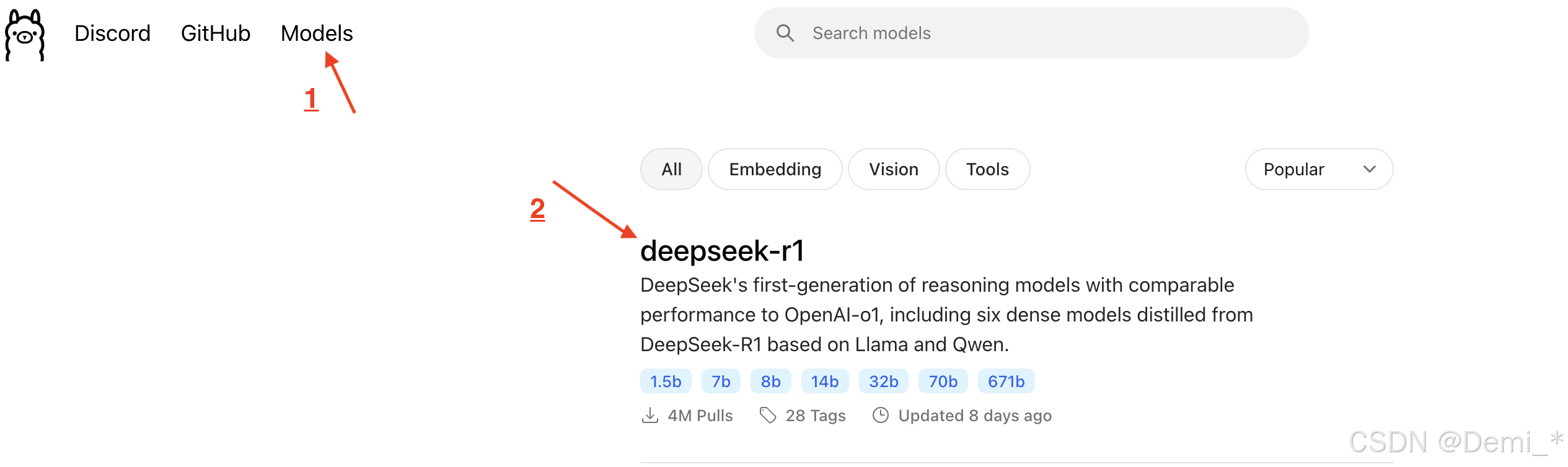 - 在刚才的Ollama界面左上角,选择模型,可以看到许多大模型,我选择的是deepseek-r1