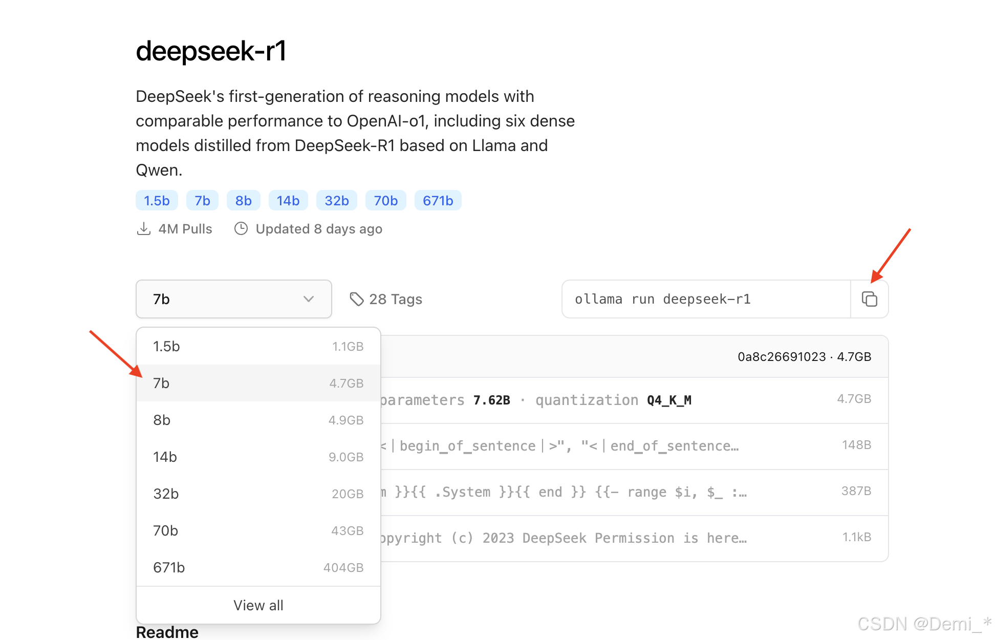 - 以7b为例,点击右侧的复制按钮, 复制代码ollama run deepseek-r1