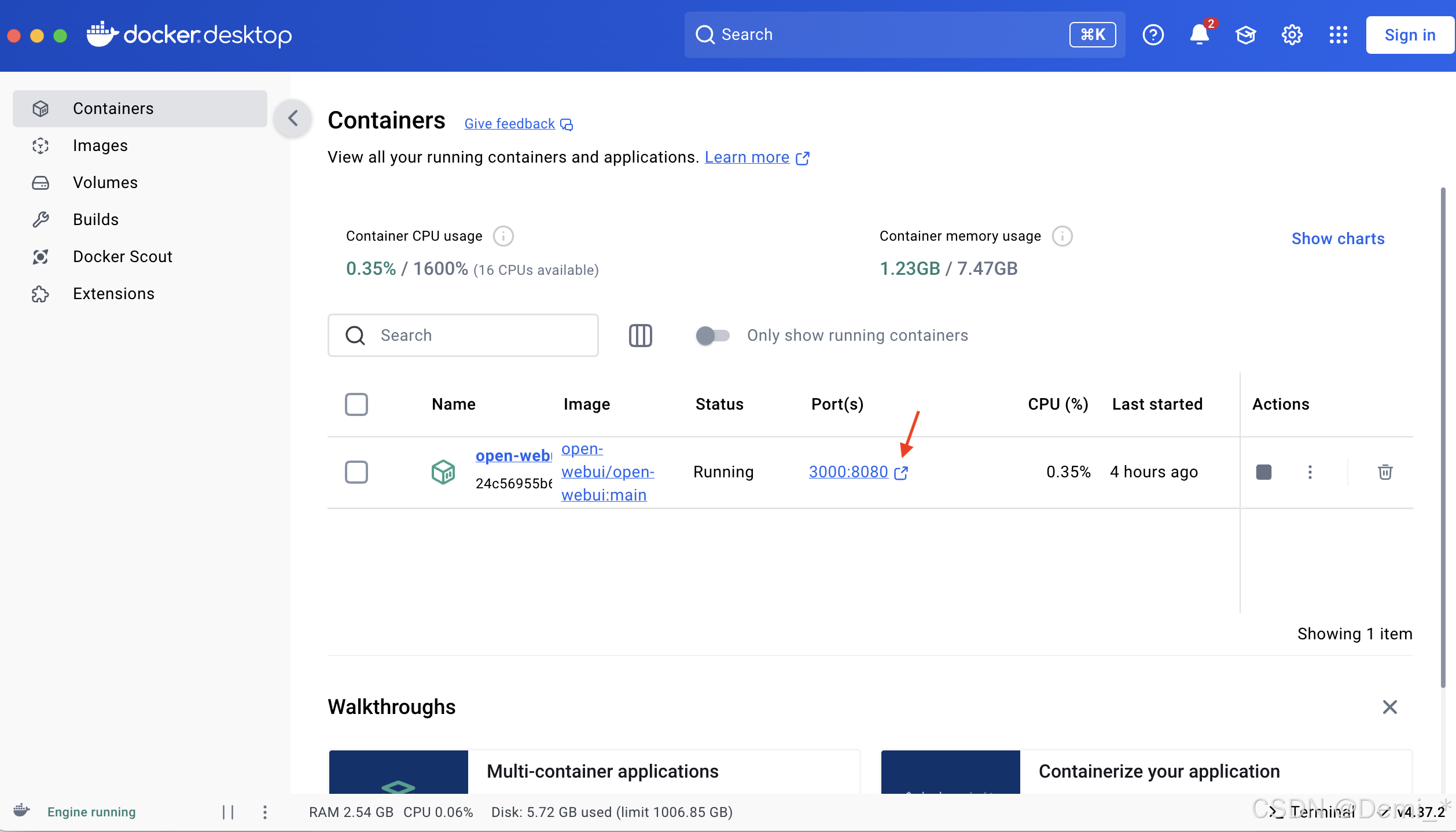- 此时就可以看到open-webui安装好了,点击Ports中的箭头就可以打卡对话界面