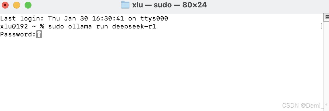 - 打开本地的命令行,用管理员权限进行下载,即sudo ollama run deepseek-r1,输入密码进行下载(下载速度稍慢)