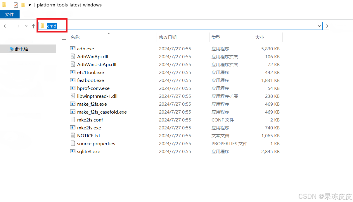 电脑:在已解压"adb调试工具"的目录下,在地址栏输出"cmd"并回车。