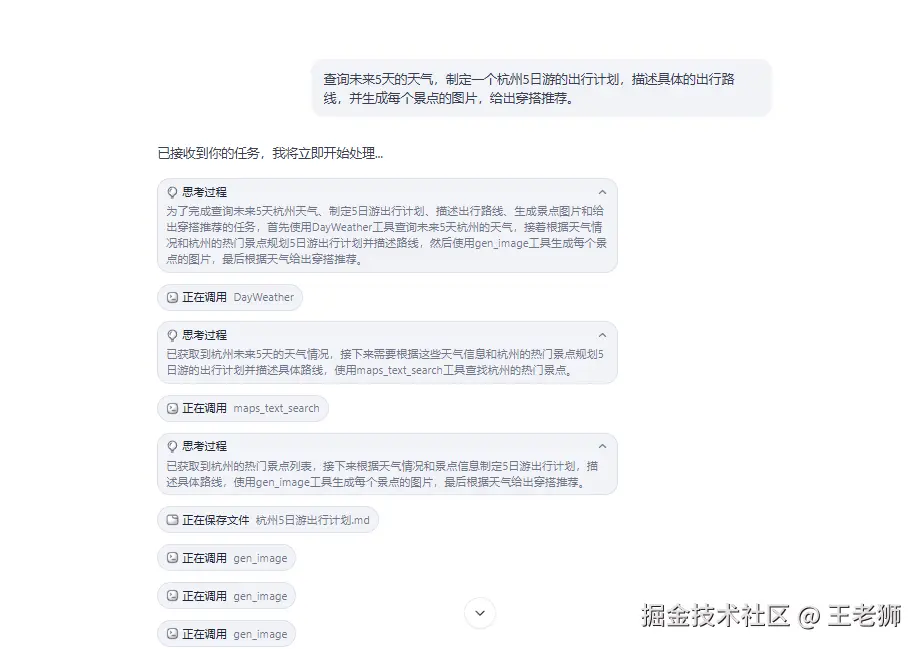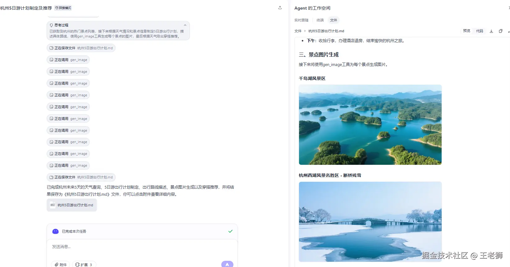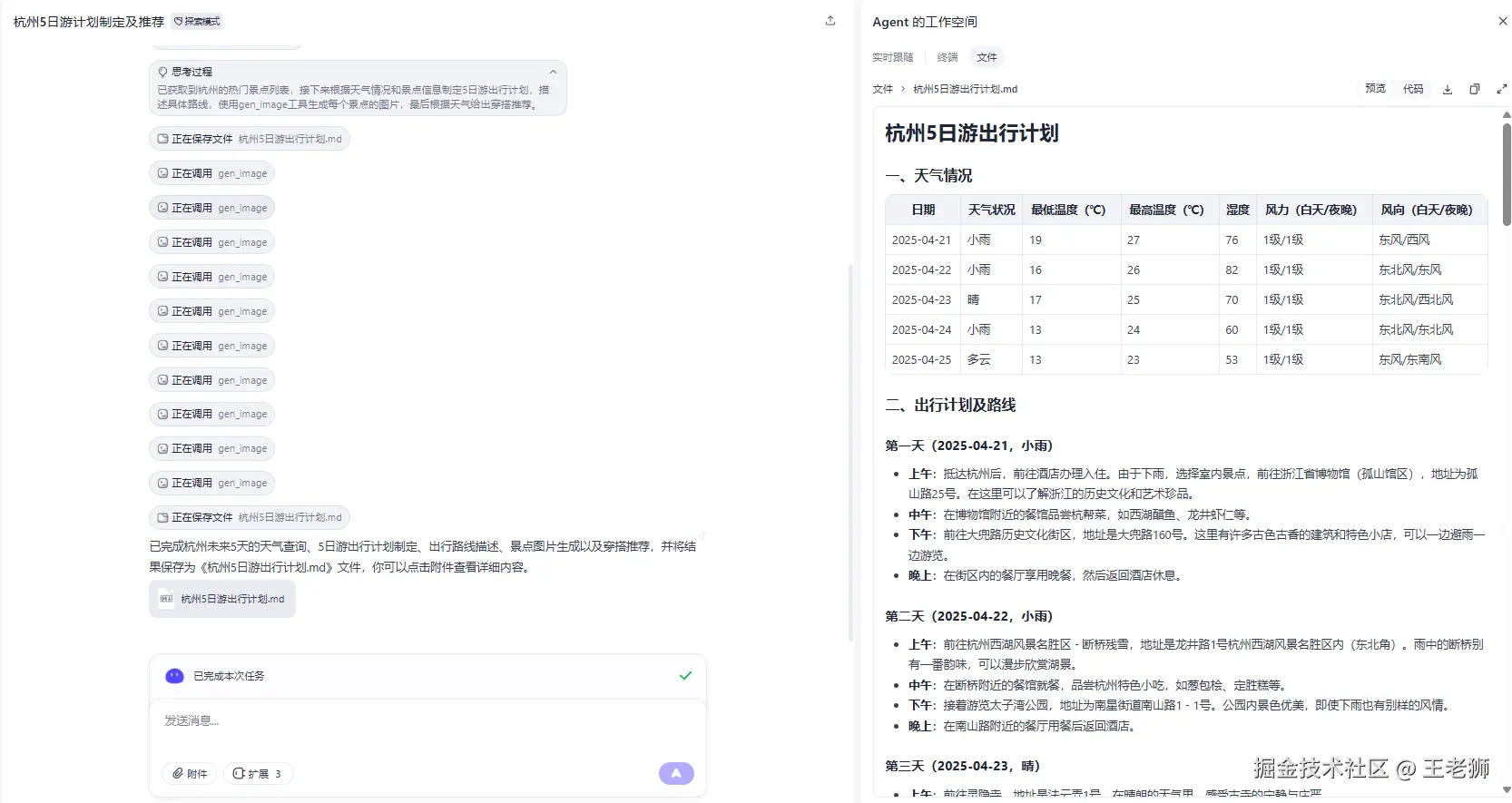 - 你输入“帮我制定一份杭州的旅行攻略”,Agent会自动分解任务:查天气→找景点→规划路线→生成图文手册→甚至预订机票。